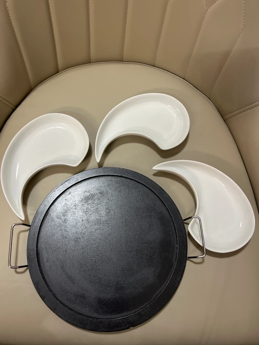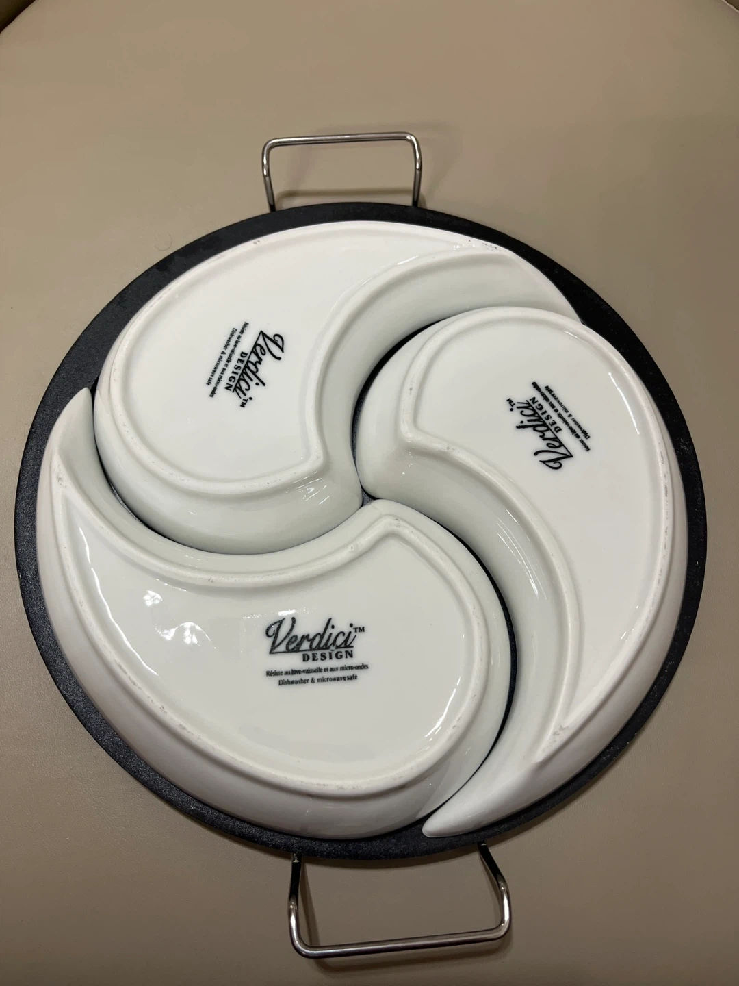 This serving set includes a black base with handles and three white ceramic dishes. The dishes are shaped to fit together on the base. Dishwasher & microwave safe.