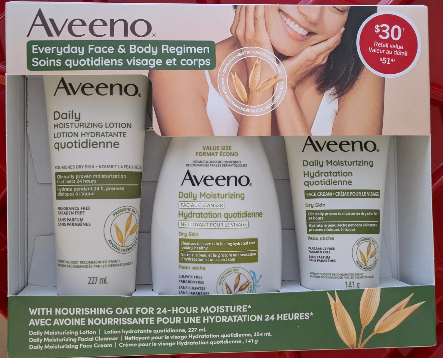 This Aveeno set includes a Daily Moisturizing Lotion (227 mL), a Daily Moisturizing Facial Cleanser (354 mL), and a Daily Moisturizing Face Cream (141 g). All products are formulated for dry skin and provide clinically proven moisturization for 24 hours. They are fragrance-free and paraben-free.
