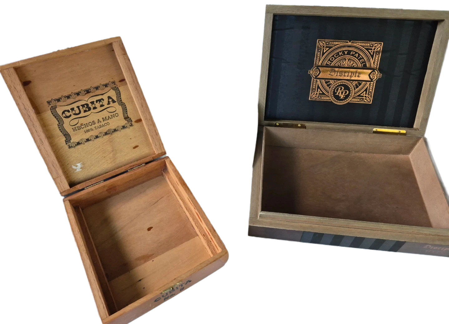 Two wooden boxes, one branded Cubita "Hechos a Mano 100% Tabaco", and the other Rocky Patel "Disciple". Both are hinged storage boxes.