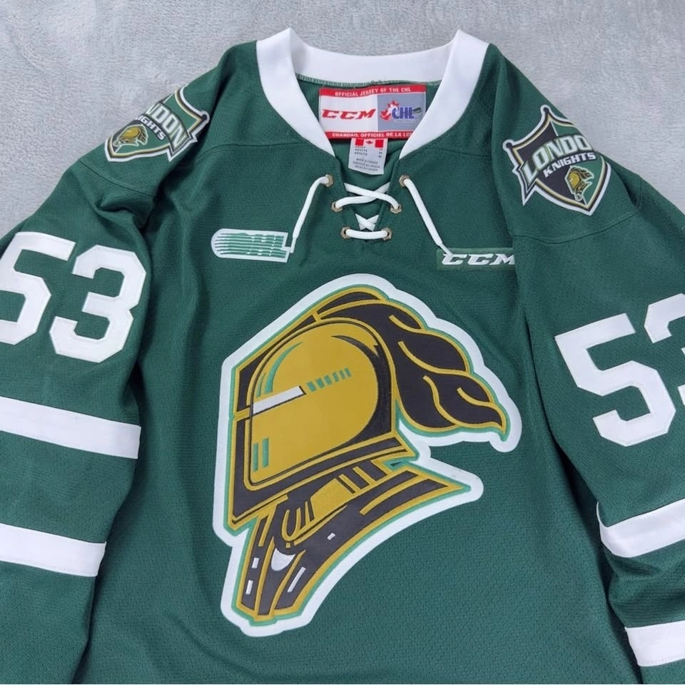 CCM London Knights Bo Horvat Signed OHL Jersey in good pre-owned condition. 100% Polyester. Made in Canada. Measurements: Armpit to armpit 23", Sleeve length 20", Length (Back of Collar to Bottom of Hem) 30". Size Medium Men's. Color Green/White. Brand CCM. See photos for reference.