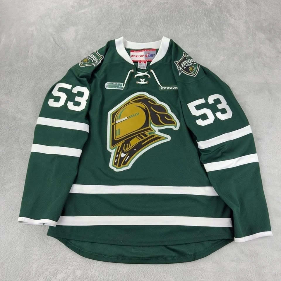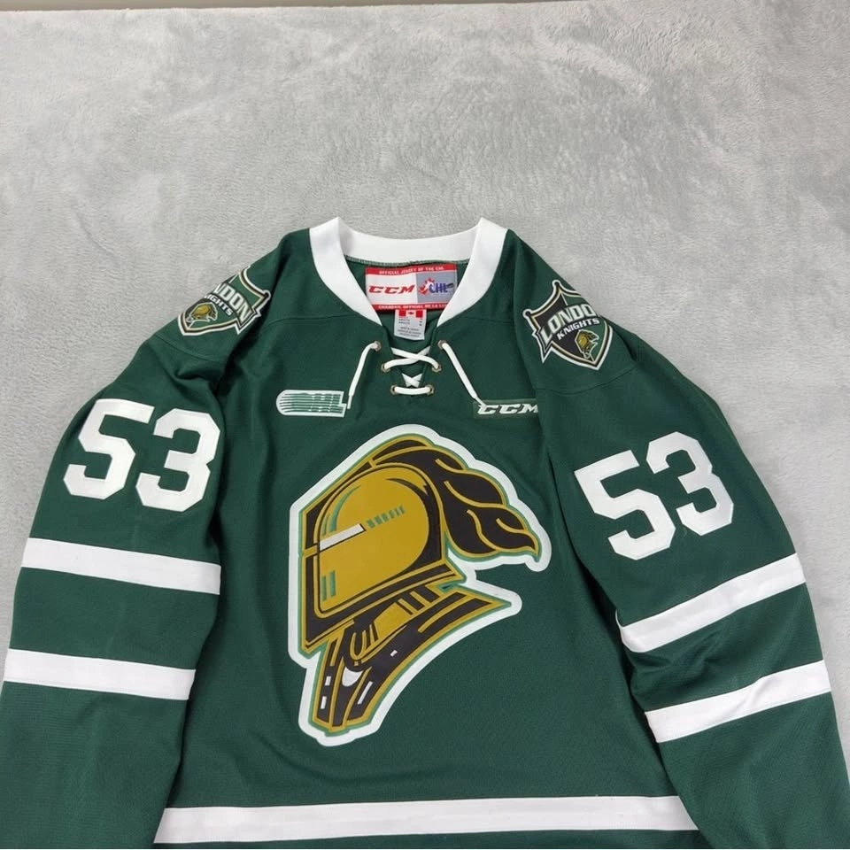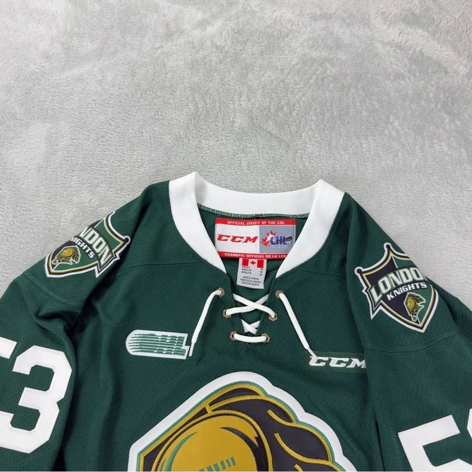CCM London Knights Bo Horvat Signed OHL Jersey in good pre-owned condition. 100% Polyester. Made in Canada. Measurements: Armpit to armpit 23", Sleeve length 20", Length (Back of Collar to Bottom of Hem) 30". Size Medium Men's. Color Green/White. Brand CCM. See photos for reference.