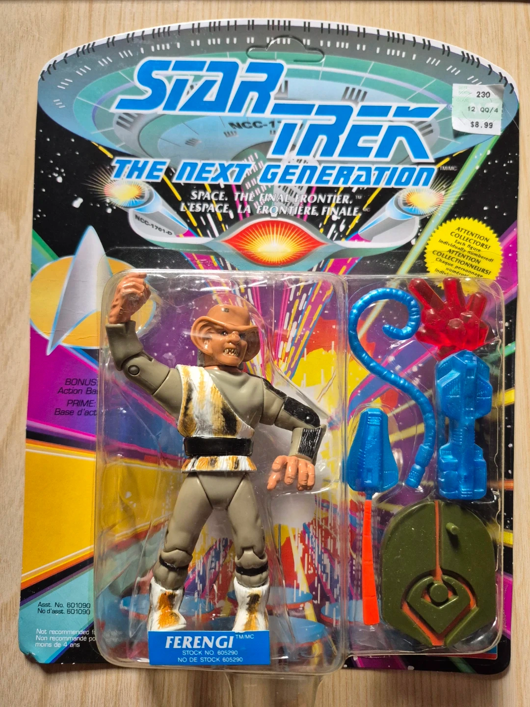 This is a Star Trek The Next Generation Ferengi action figure. It comes with accessories and is still in its original packaging. Play along with the adventures of Starfleet! Card has some wear on corners.
