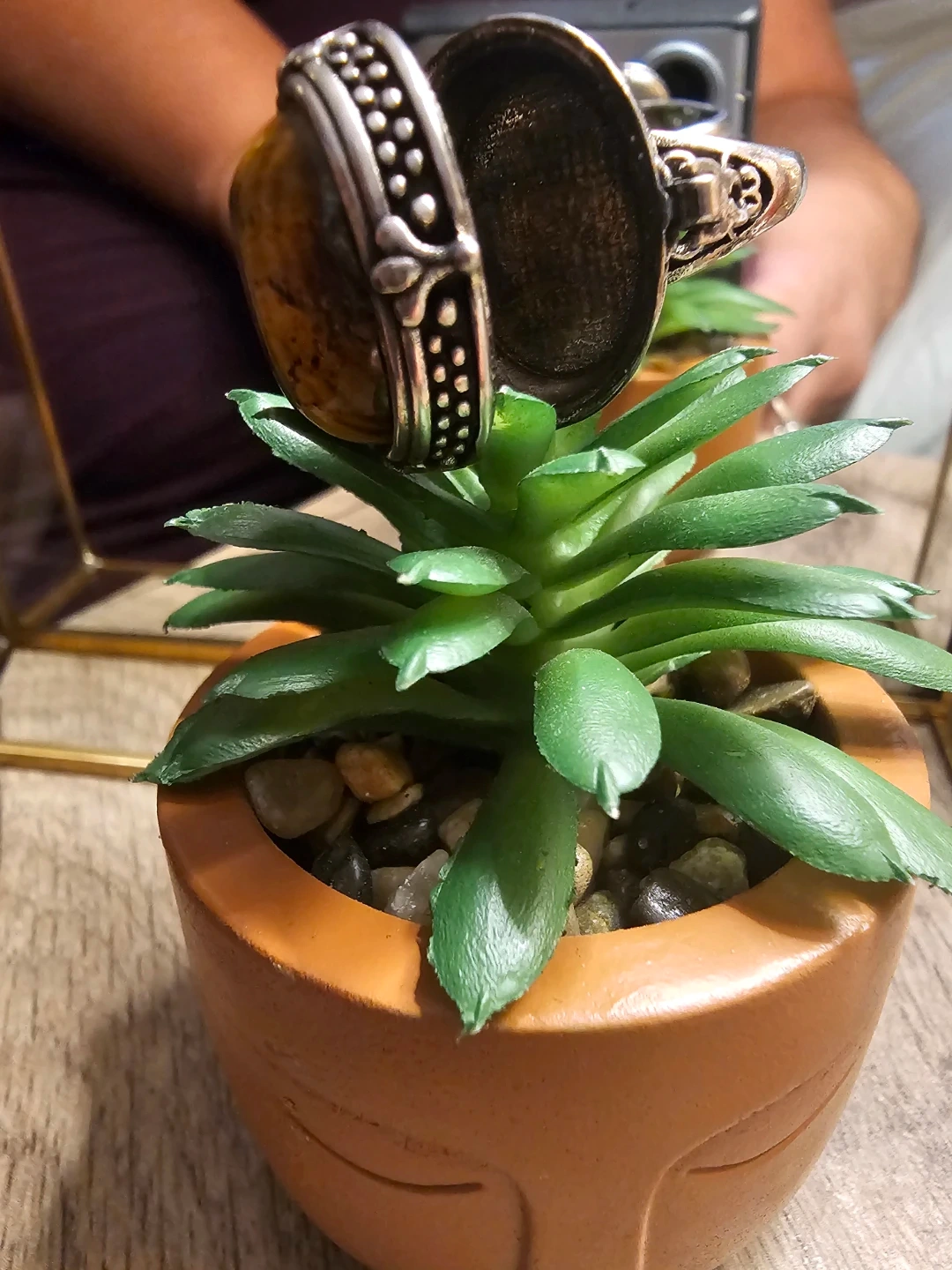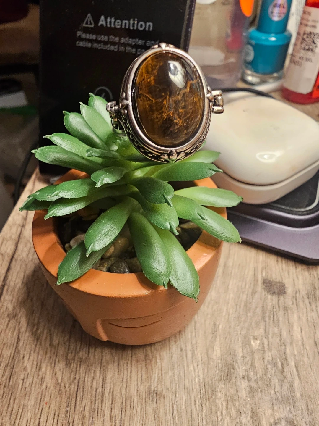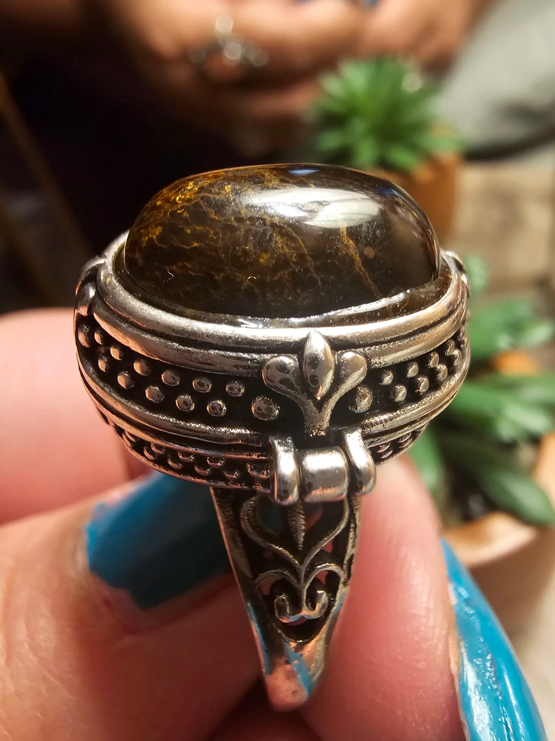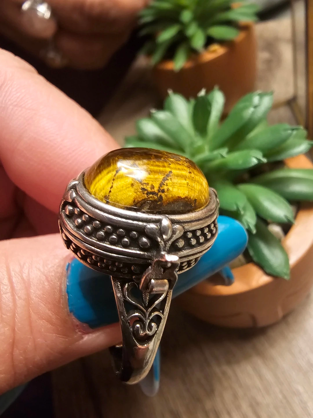 Selling a beautiful vintage style poison ring featuring a Tiger eye crystal stone. The ring has a detailed silver band with a unique design. It's in great condition and ready to wear!