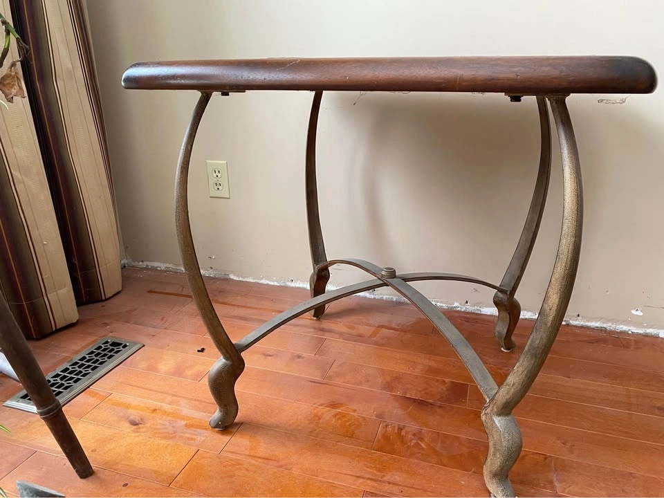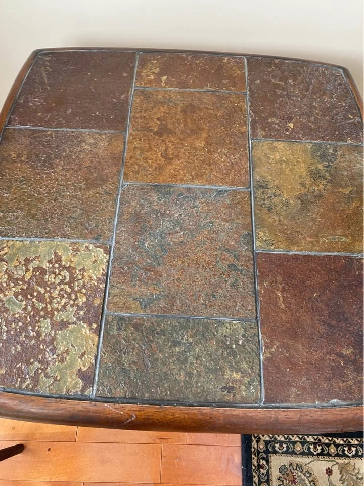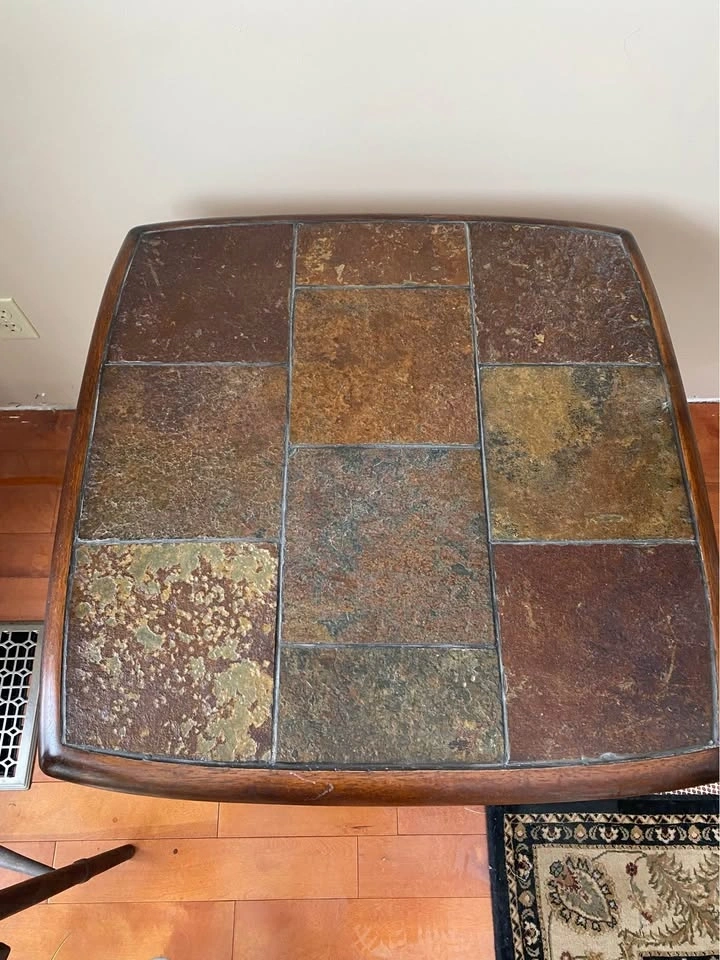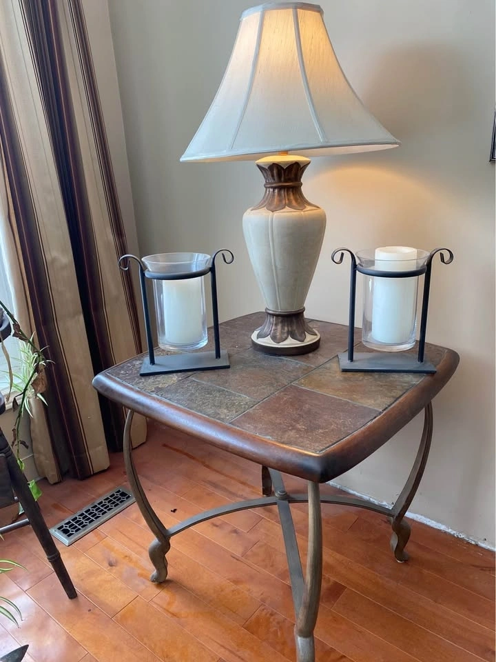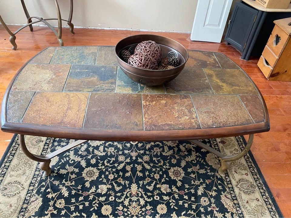 Solid construction tables with slate top and metal legs. Rounded edges so safe around children. Easy to clean up spills. No worries of rings or stains from water spills etc. Coffee table dimensions: Length 51”, height 20.5”, Width 32”. Two side/end tables: length and width 28 ”, height 26”. Pick up in Lynden from smoke-free home. (We are part of city of Hamilton and are between Dundas and Brantford)