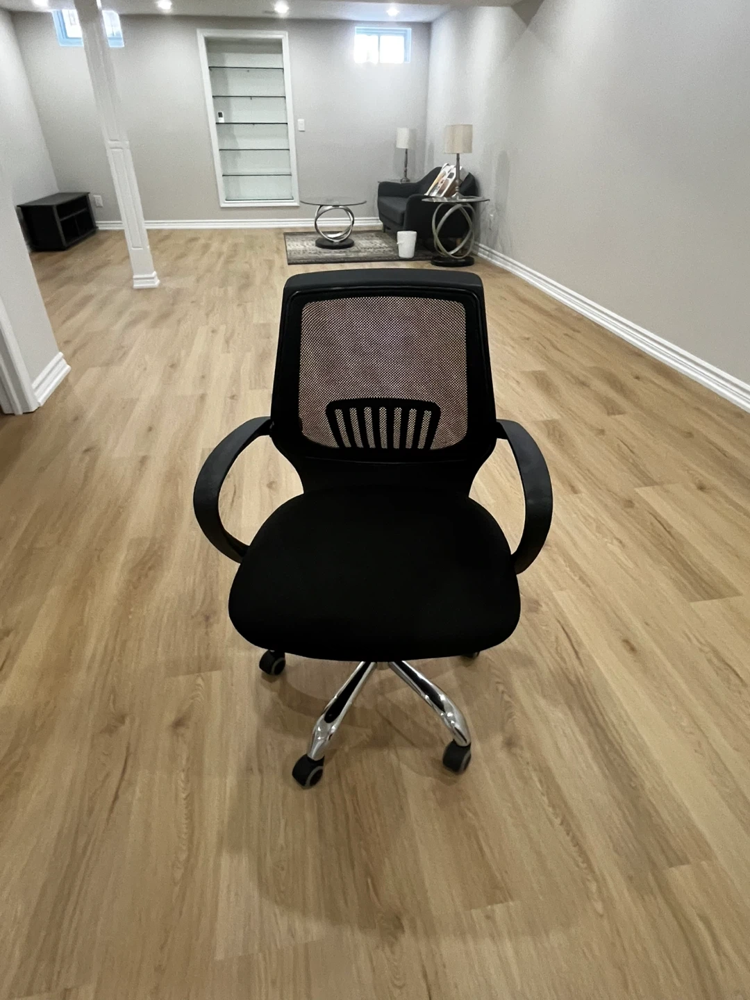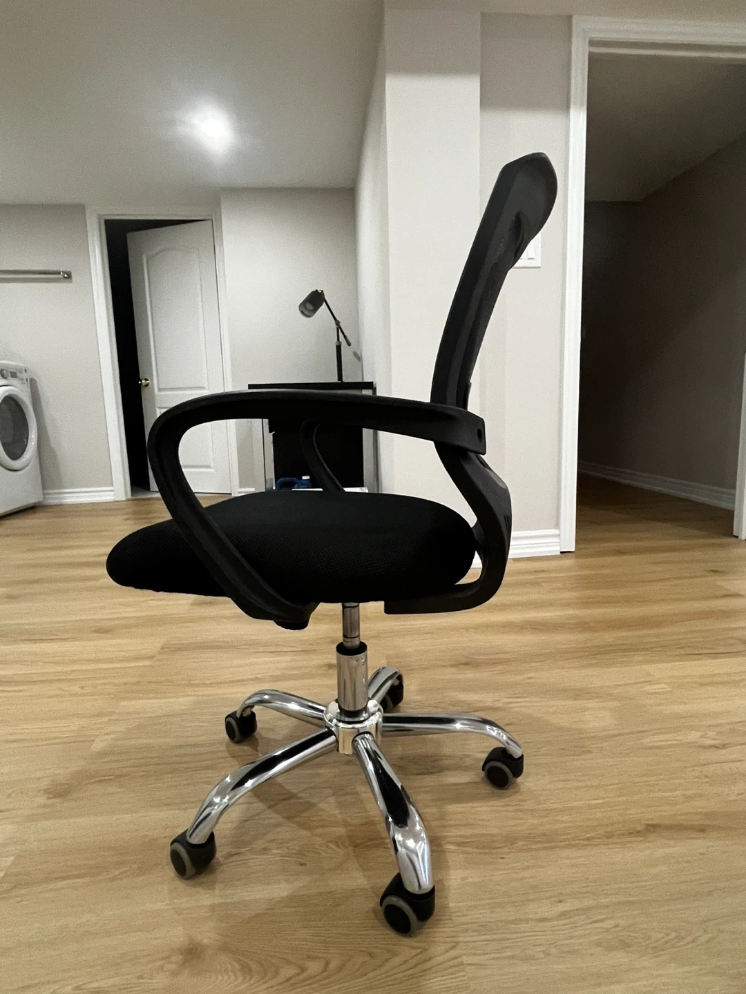 This black mesh office chair features a comfortable seat and adjustable height. It's designed with a five-wheel base for easy mobility. The mesh back provides breathability.
