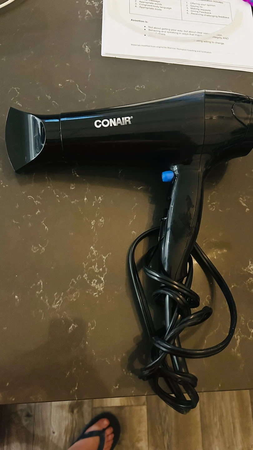 This is a black Conair hair dryer. It has a blue button on the handle. It's a standard size for home use. This dryer is useful for quickly drying hair after washing.