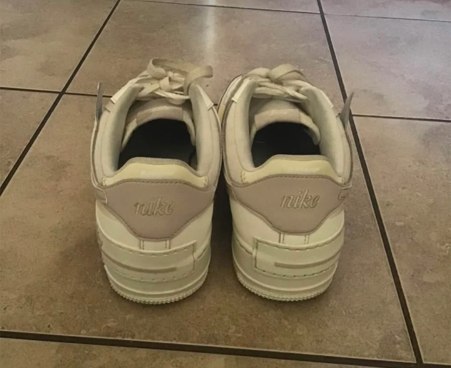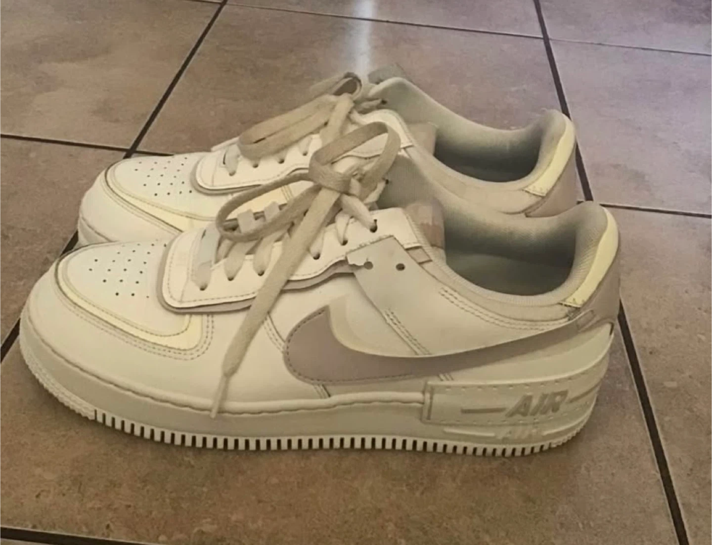 White and light grey Nike Air Force 1 Shadow women's sneakers. Leather upper with classic Nike Air cushioning. These are a stylish choice for everyday wear!