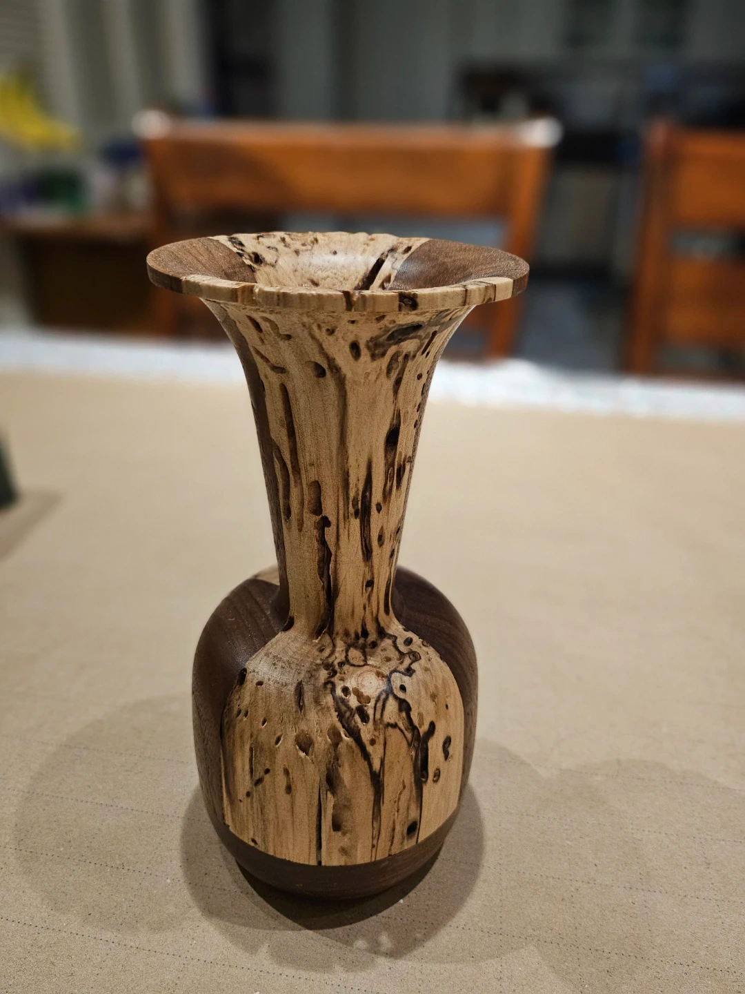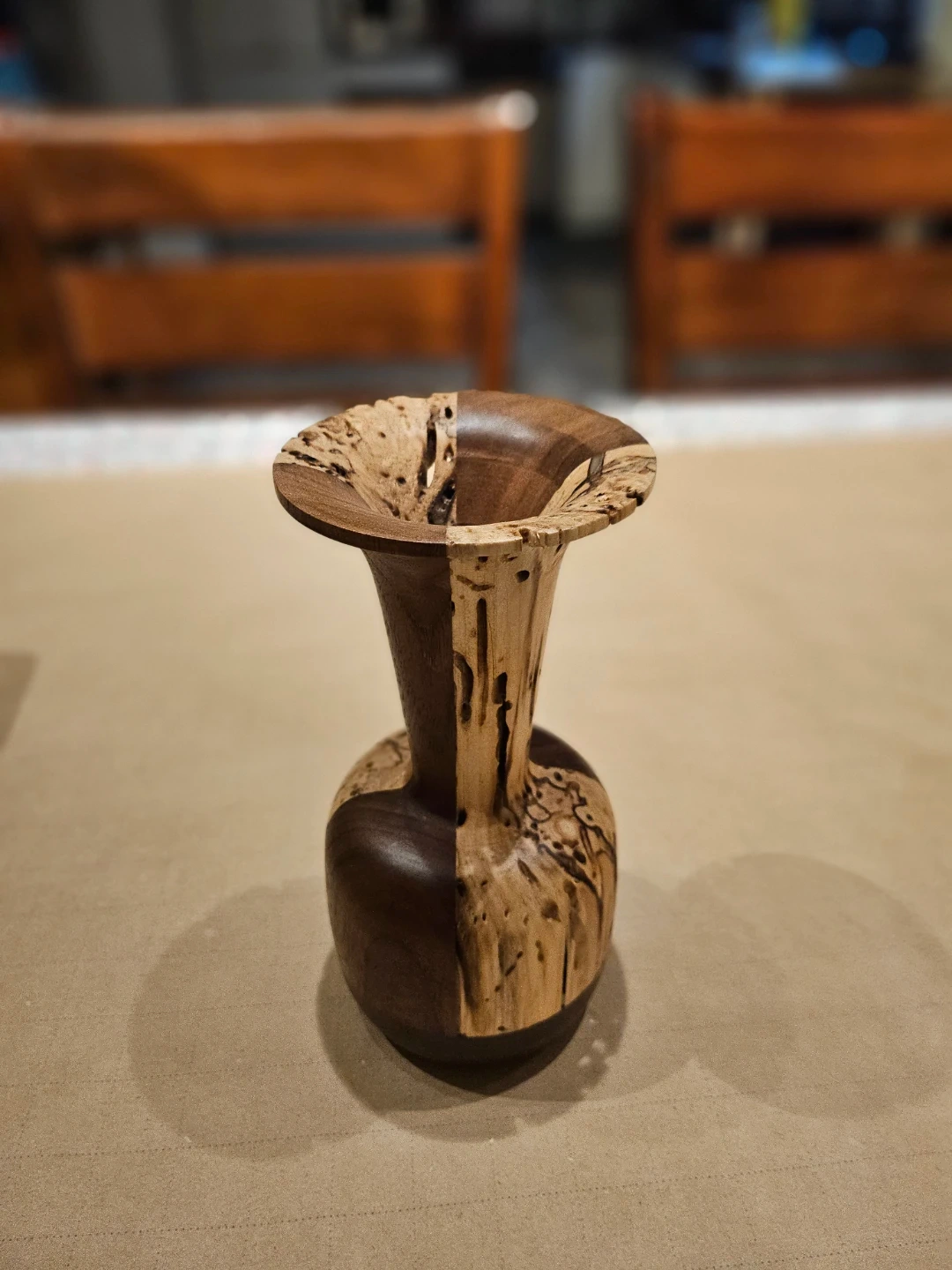 This is a unique handmade wooden vase. It's crafted from two different types of wood, creating a beautiful contrast. The vase has a distinctive opening and a rounded base.