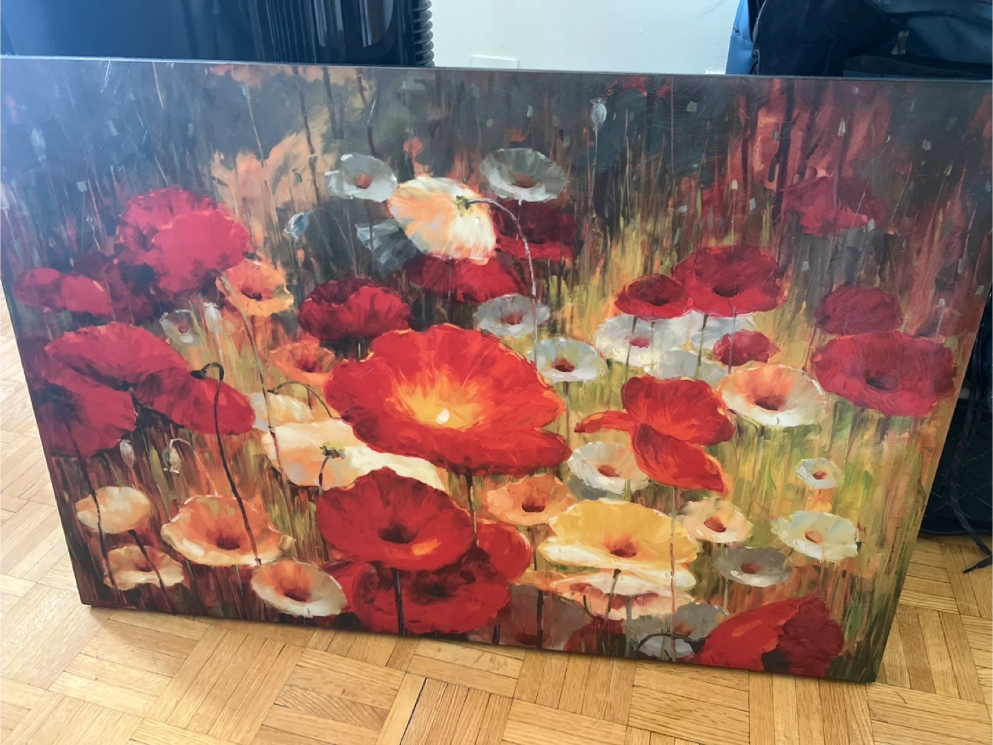 Decorative canvas wall art featuring a vibrant painting of red and white poppies. Measurements are approximately 34 inches wide by 23 inches tall. It's a beautiful piece to brighten up any room!
