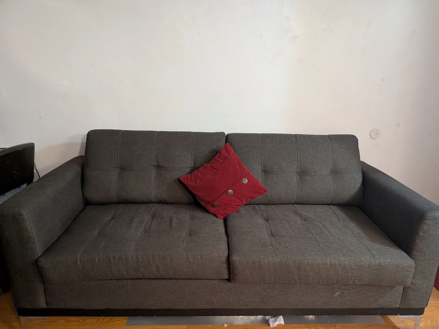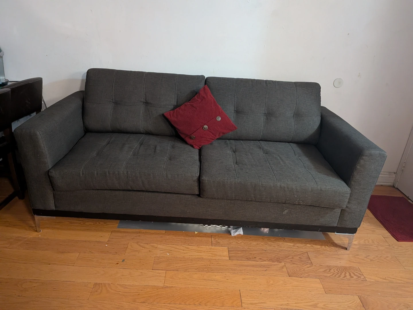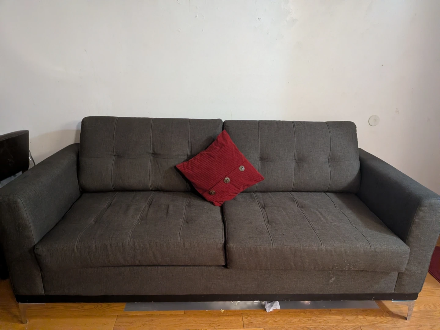 This is a dark grey sofa with button tufting on the back cushions. It has a modern design with metal legs. A red decorative pillow is included.