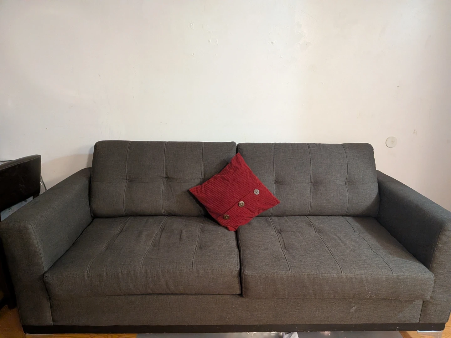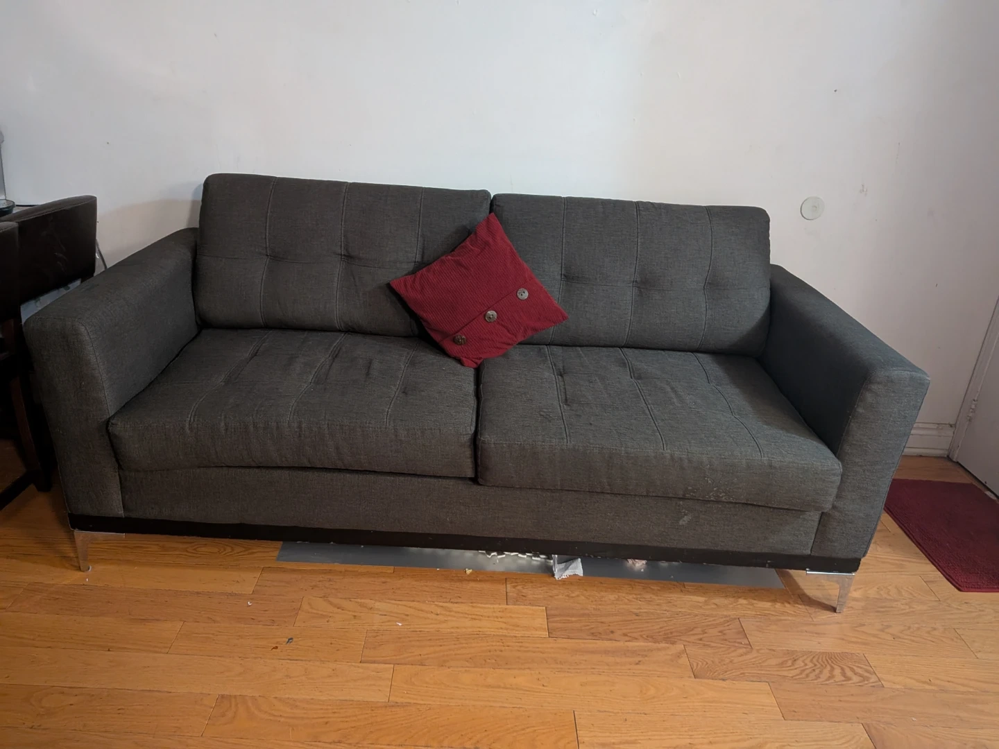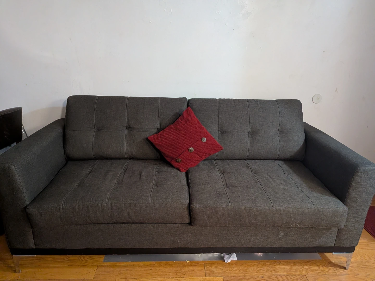 This is a dark grey sofa with button tufting on the back cushions. It has a modern design with metal legs. A red decorative pillow is included.