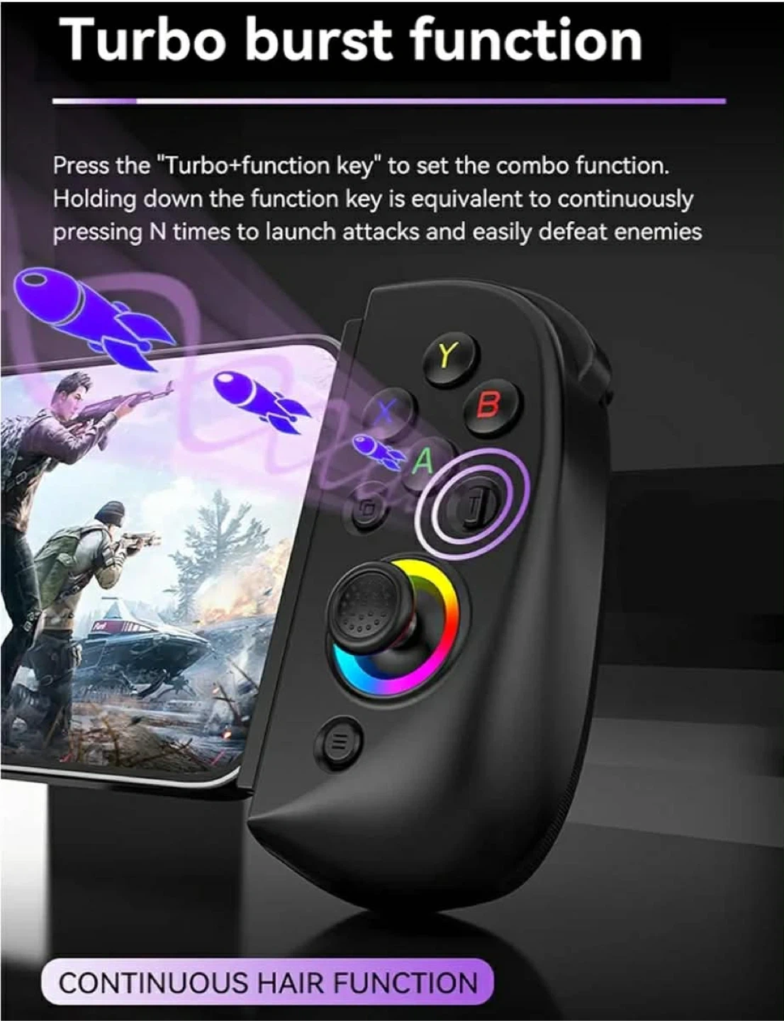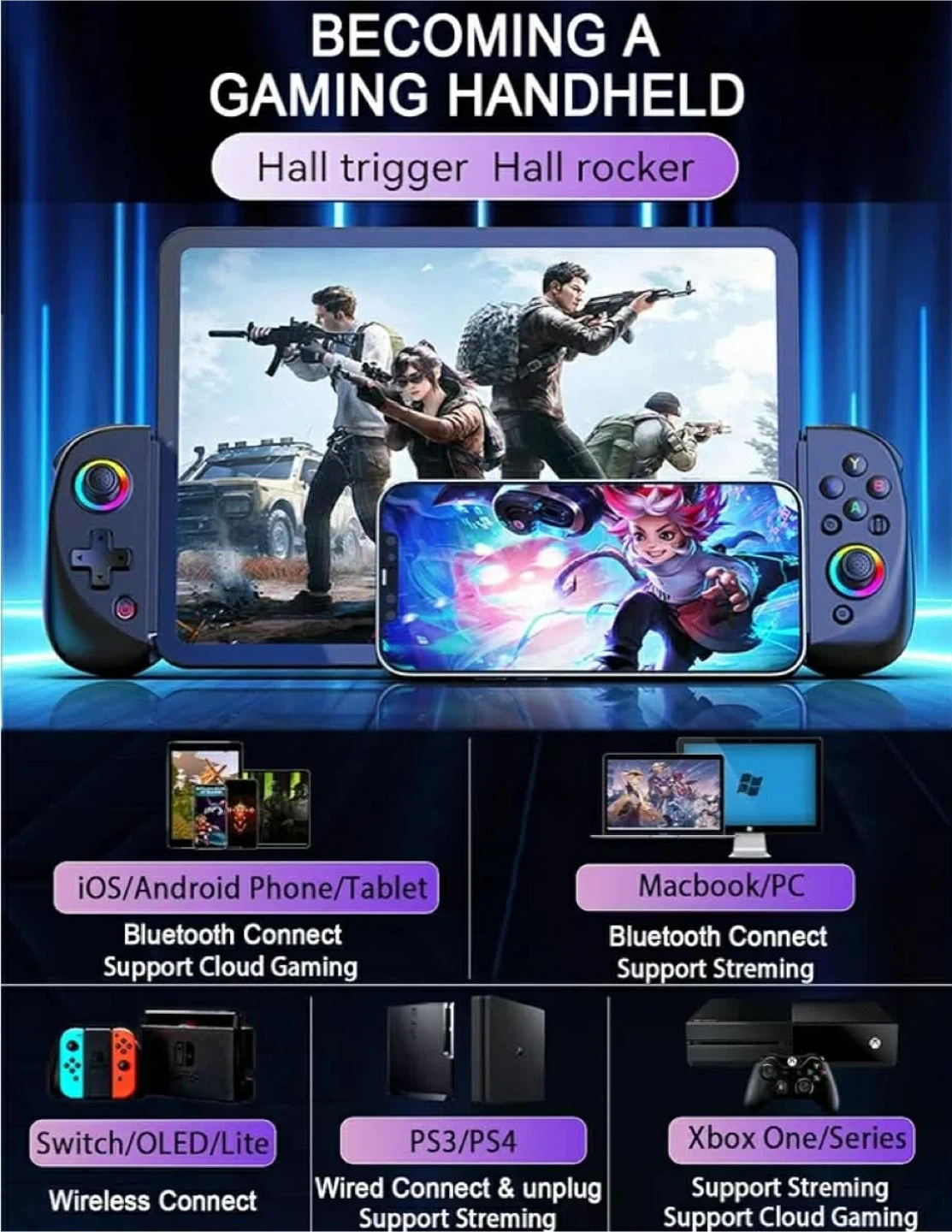 This is the BSH D8 wireless controller for mobile devices. It features RGB ring lights with multiple modes, including light off, monochromatic, and colorful. This controller supports iOS/Android phones and tablets, MacBooks, PCs, and is also compatible with Switch/OLED/Lite, PS3/PS4, and Xbox One/Series. It connects via Bluetooth for most devices and wired for PS3/PS4. The controller has a turbo burst function and can be used as a handheld gaming device.