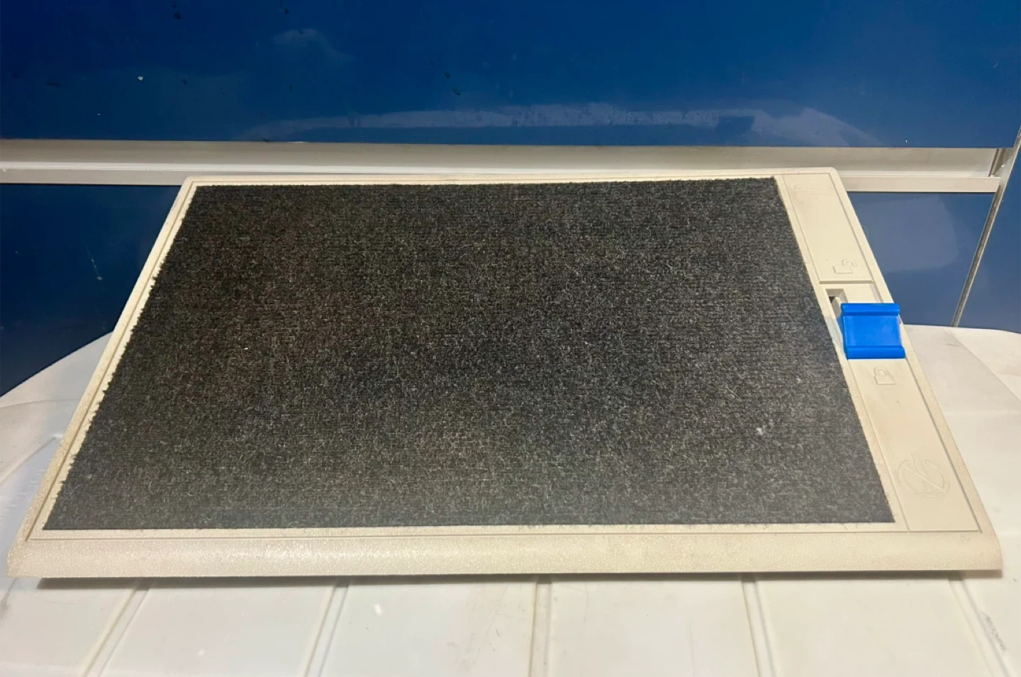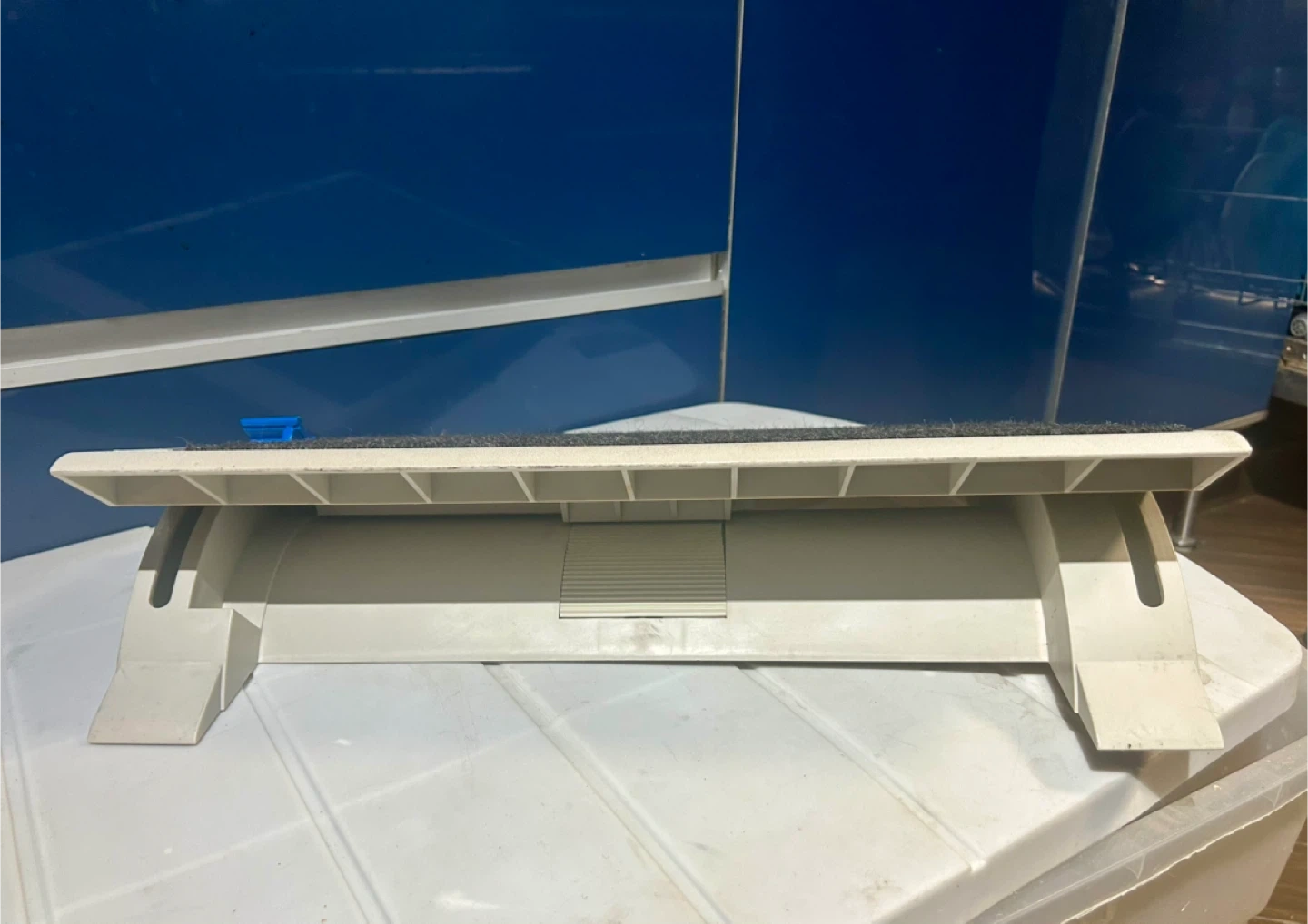 This is an adjustable footrest designed to enhance your ergonomic setup. The footrest is in used condition but still provides excellent support and comfort. It features a textured surface to prevent slipping and an adjustable angle for personalized comfort.