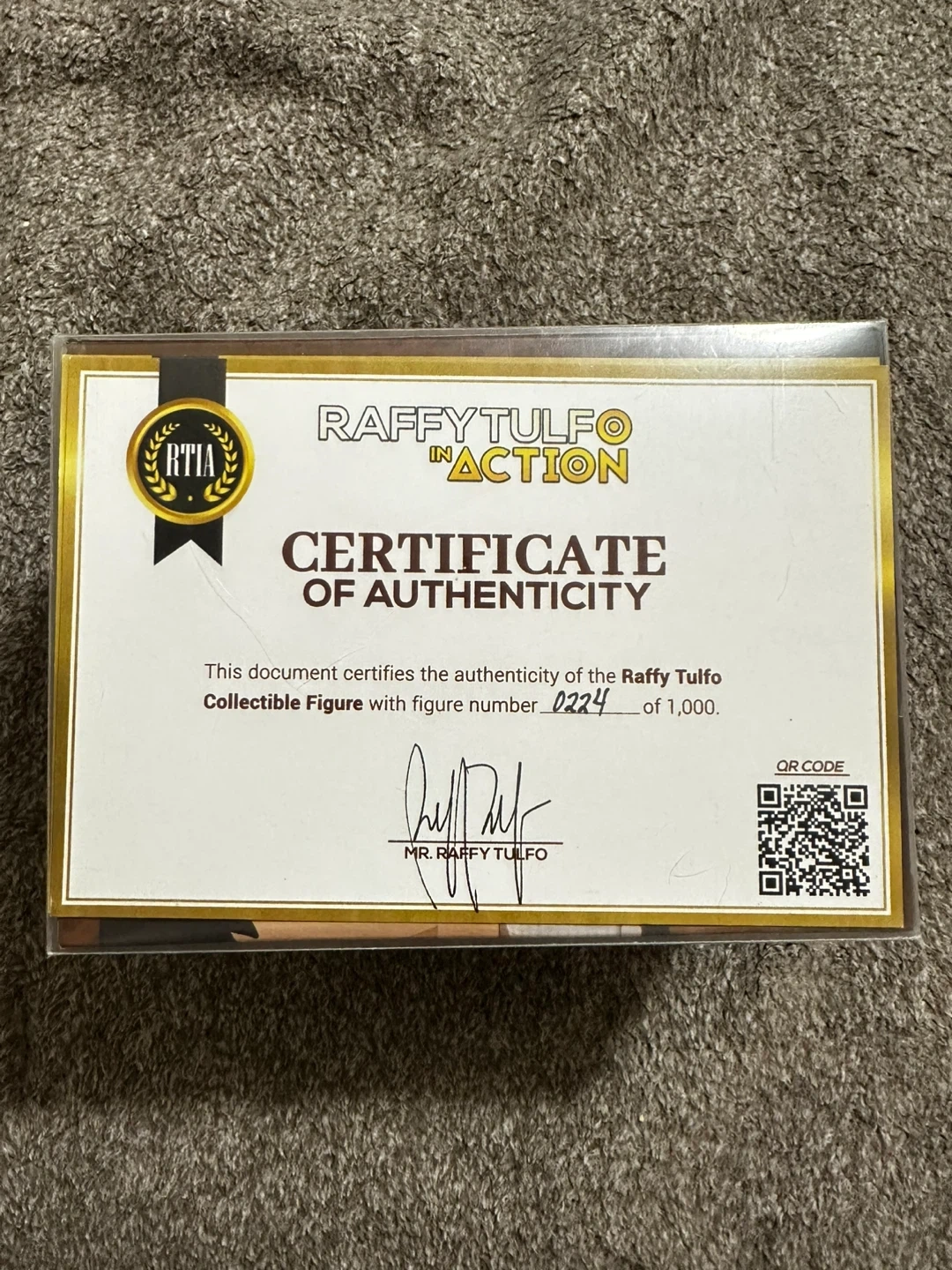 This is a Raffy Tulfo in Action collectible figure, number 0224 of 1,000. It's signed by Mr. Raffy Tulfo. This figure represents the Filipino broadcast journalist.