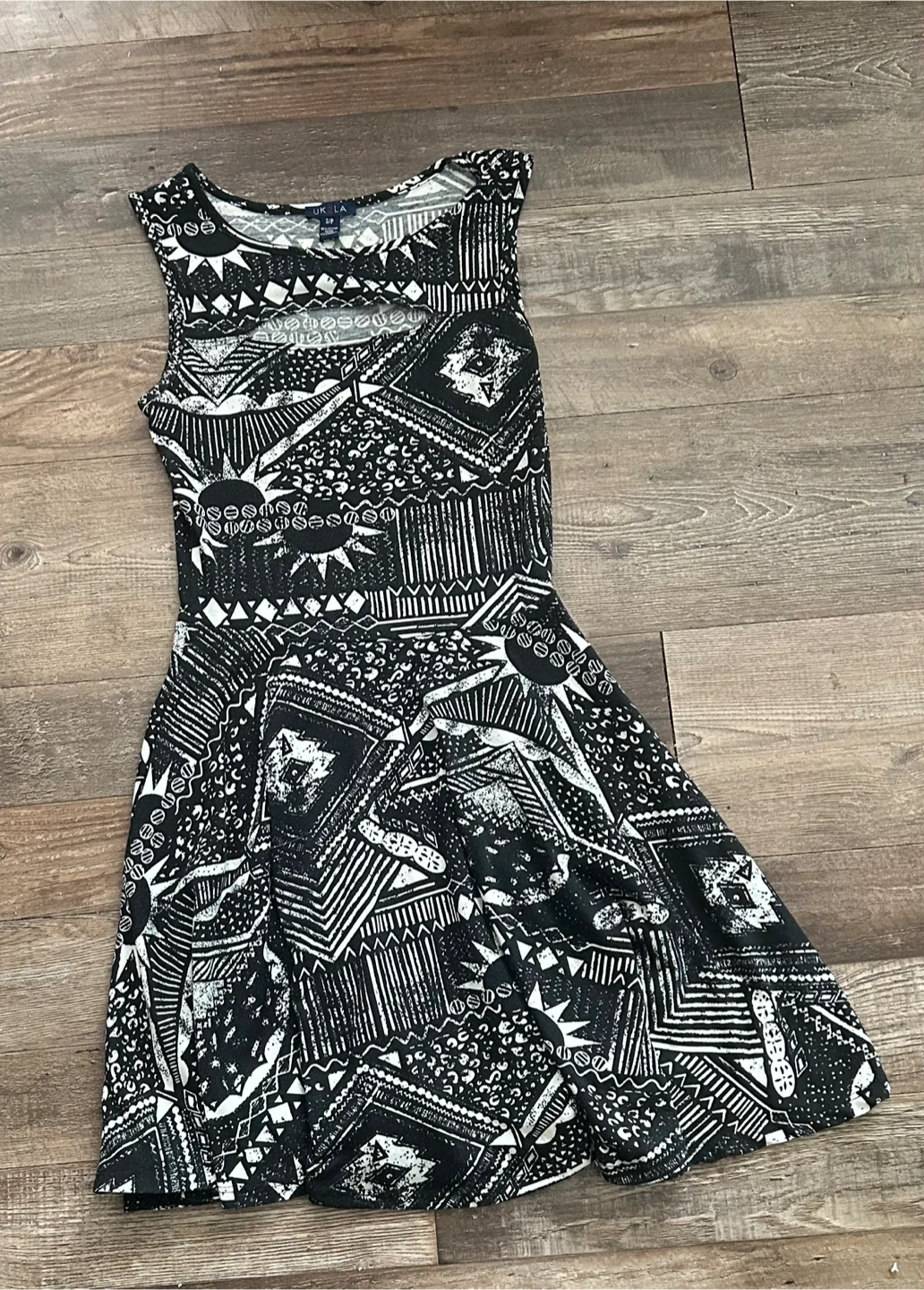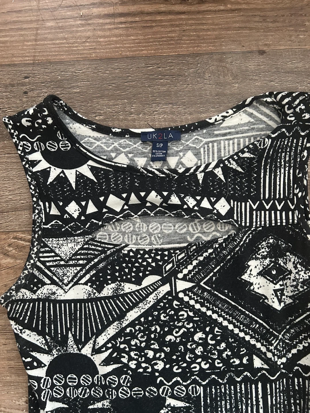 This UK2LA dress features a striking black and white geometric print throughout. It's a sleeveless, crew neck style with a cutout detail at the chest. Made from 95% cotton and 5% spandex for comfort and stretch.