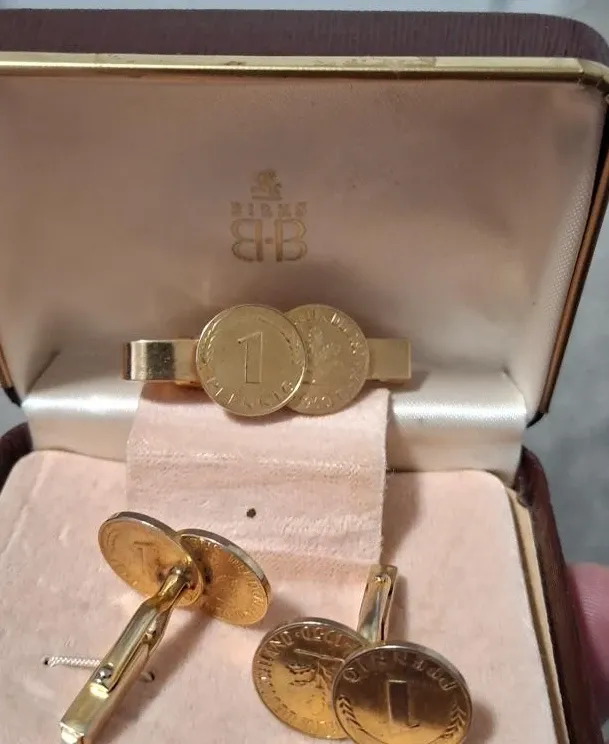 A classic Birks set featuring cufflinks and a tie clip, accented with coin details. This set includes the original presentation box. It's a distinguished accessory for any formal occasion.
