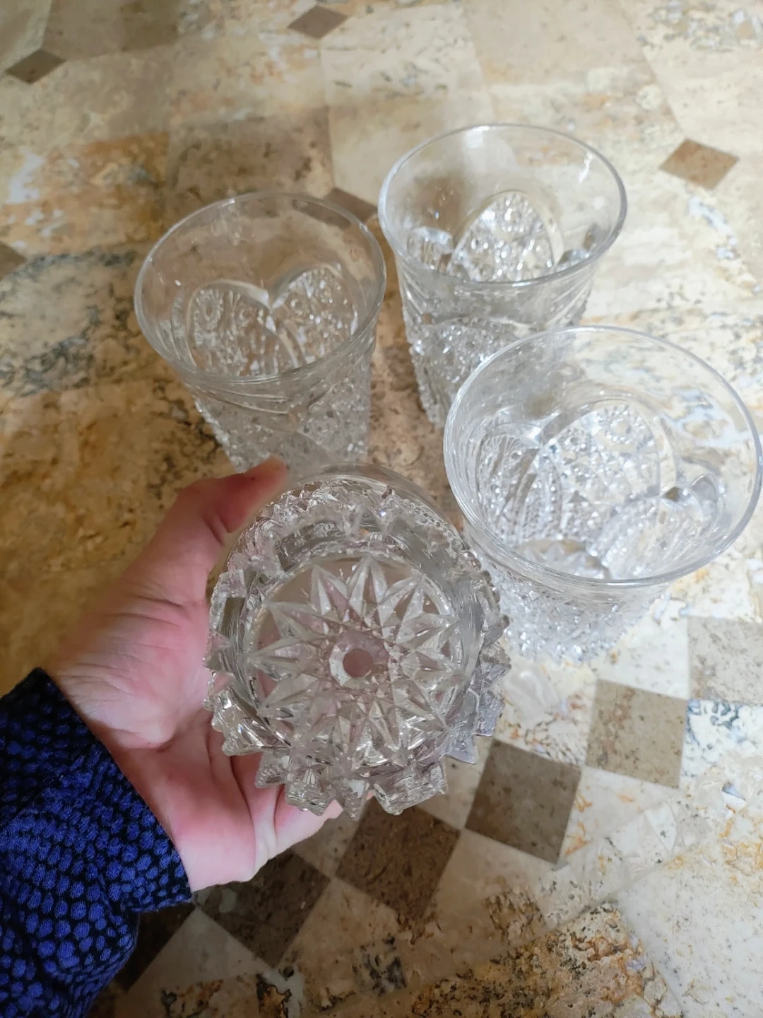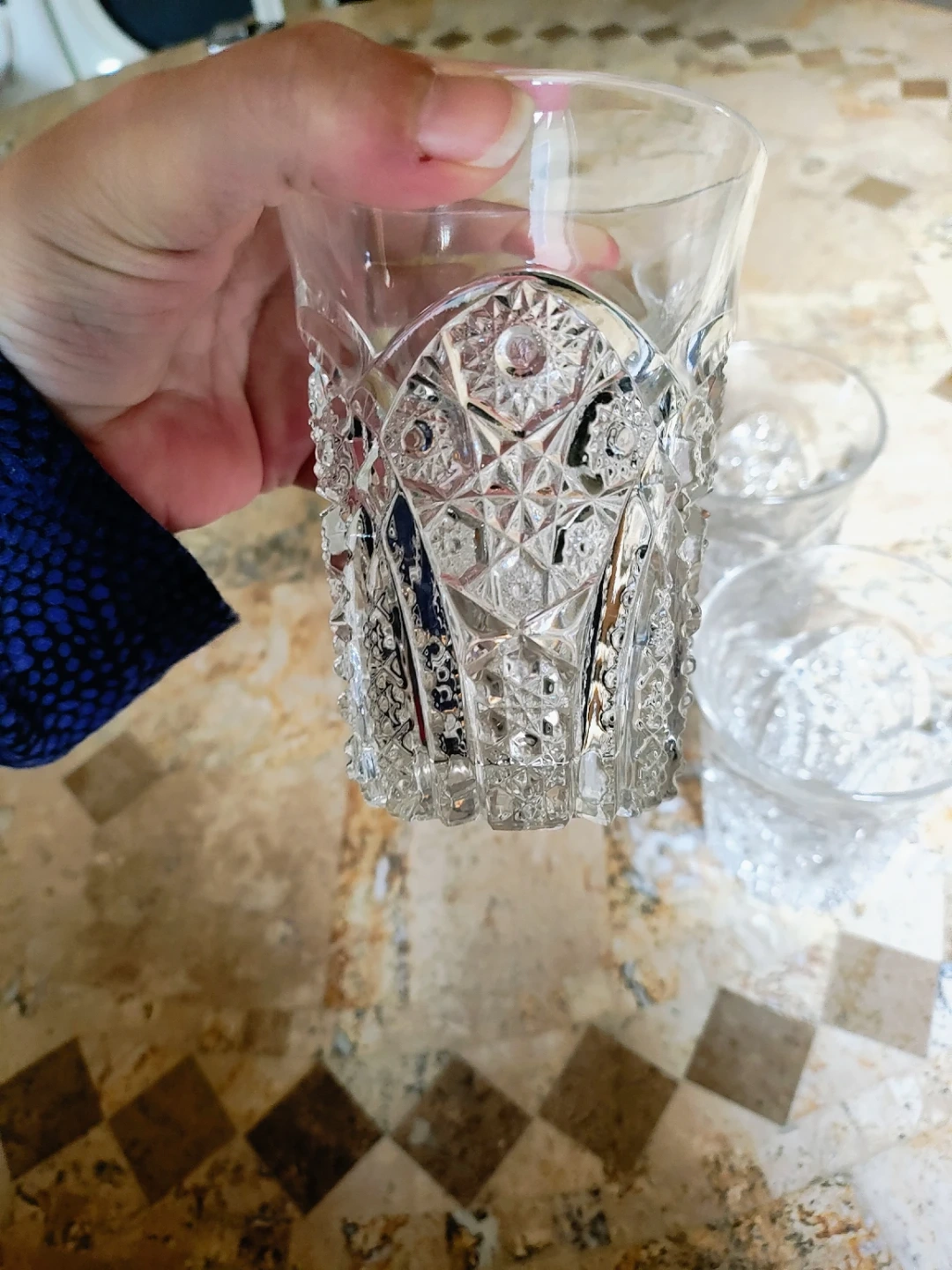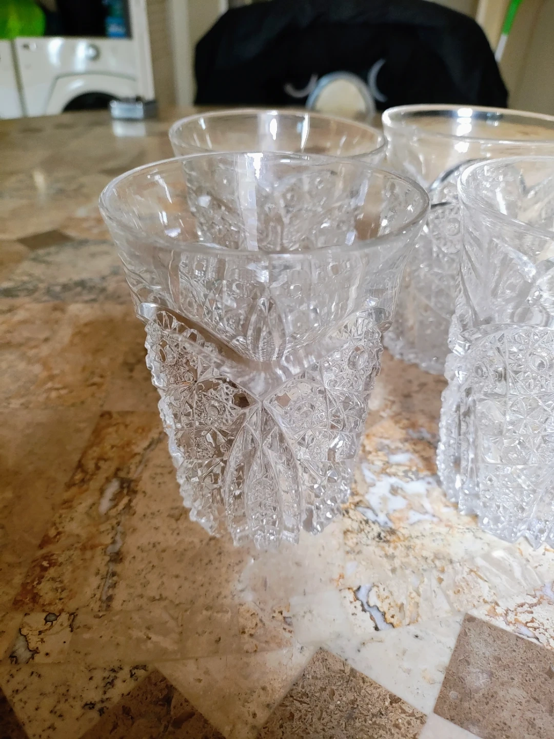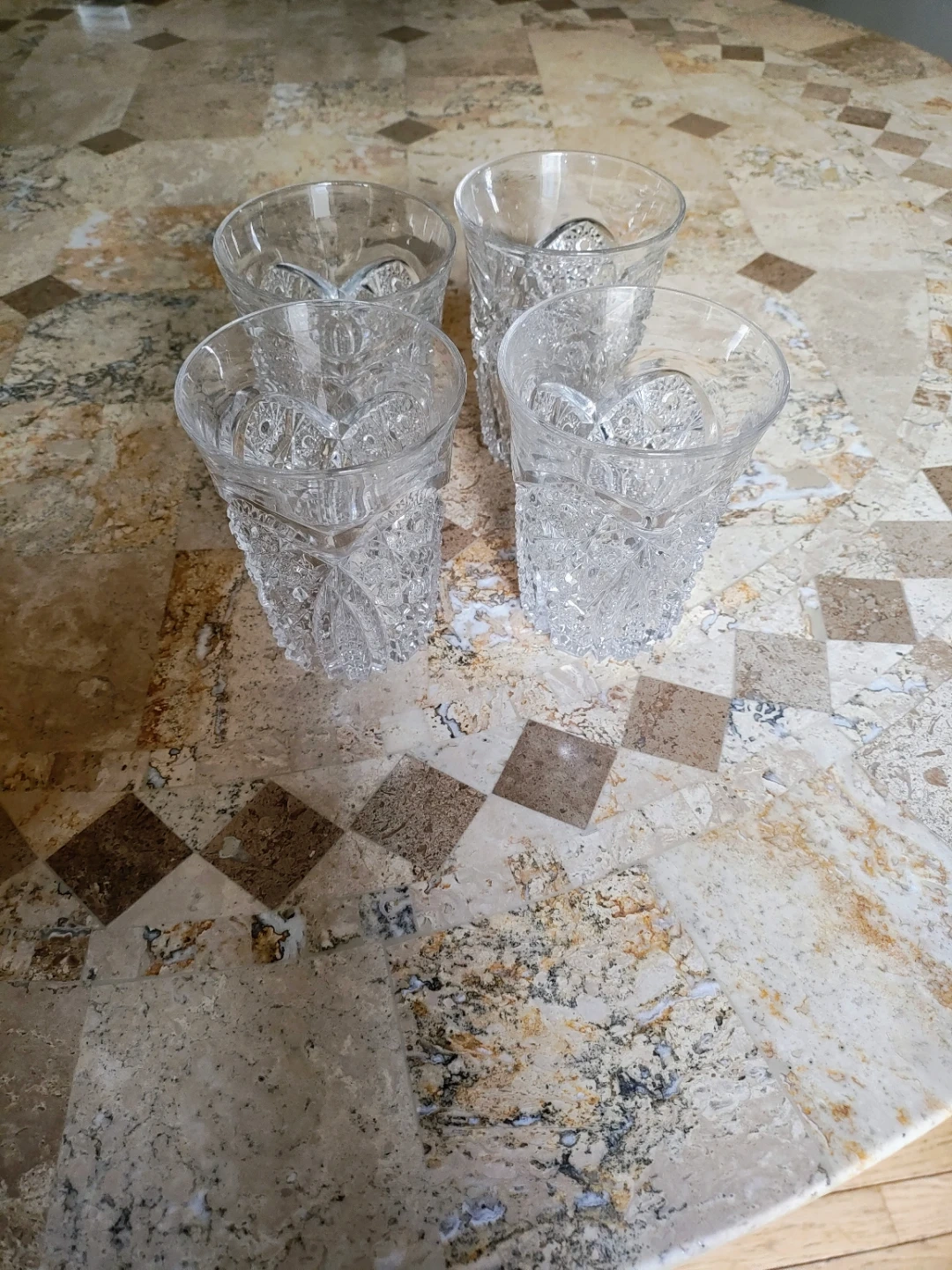 This set includes four clear, cut glass tumblers with an intricate hobstar and fan pattern. They're perfect for serving water or other beverages. Glass construction. Approximately 4" tall. Cash only pick up only.