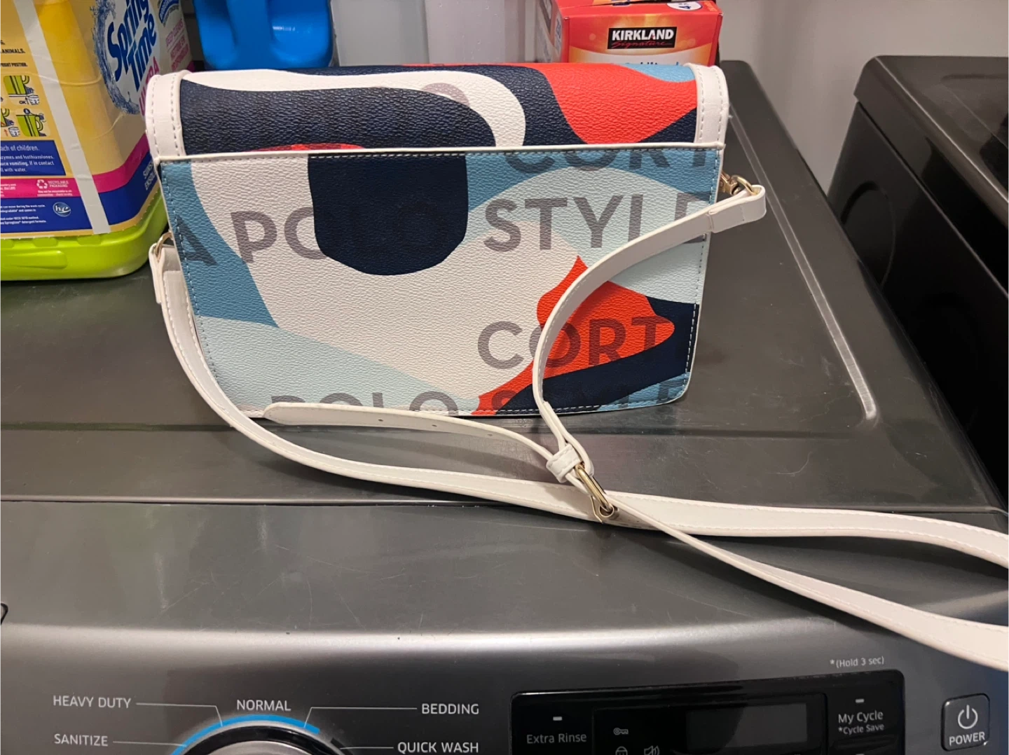 Polo Style crossbody bag with a colourful abstract print. It features an adjustable strap and a secure clasp closure. Inside, you'll find a couple of handy pockets for organization.