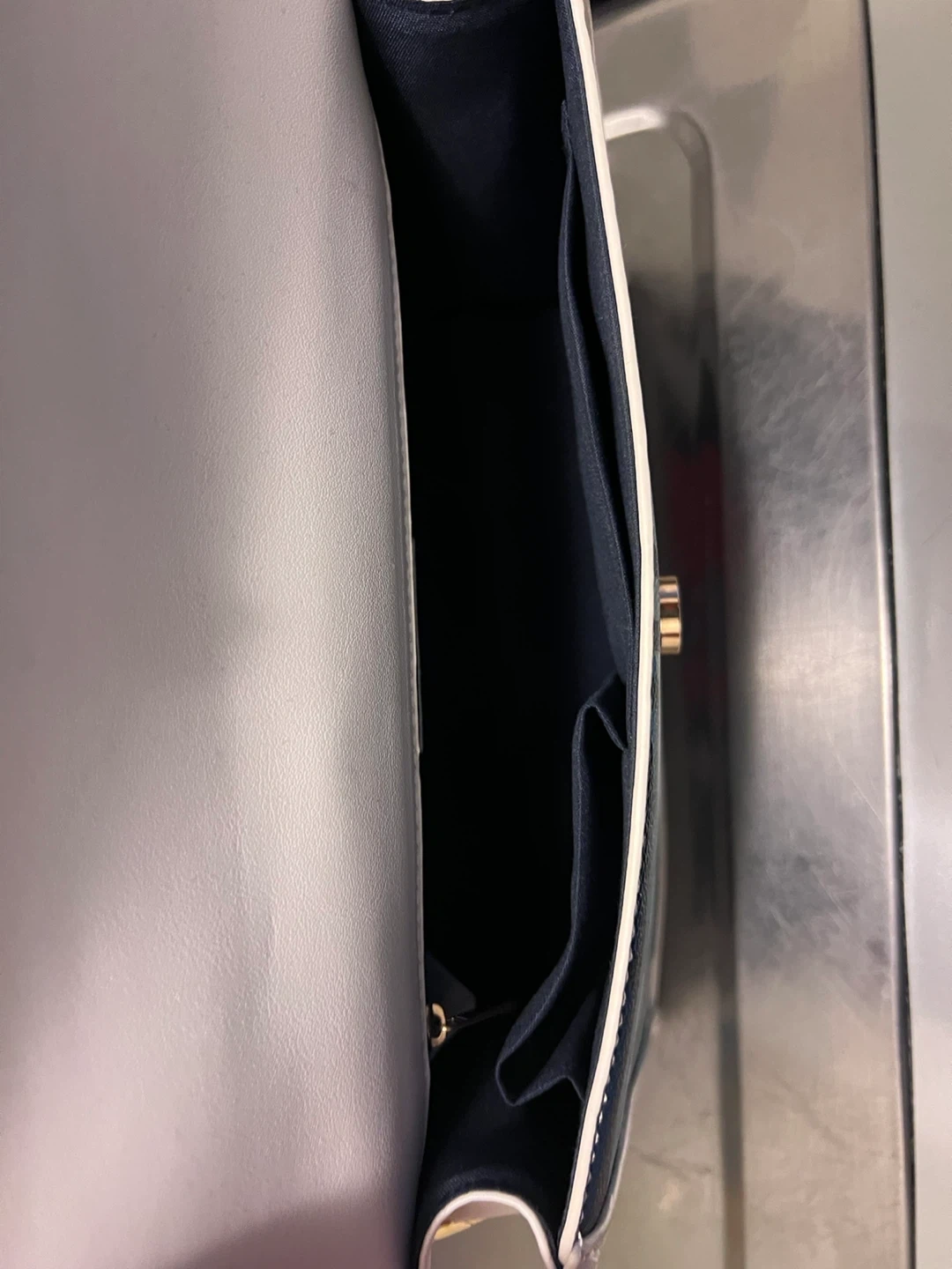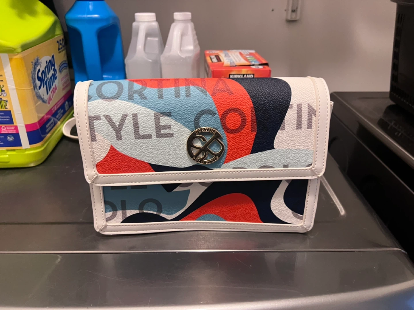 Polo Style crossbody bag with a colourful abstract print. It features an adjustable strap and a secure clasp closure. Inside, you'll find a couple of handy pockets for organization.