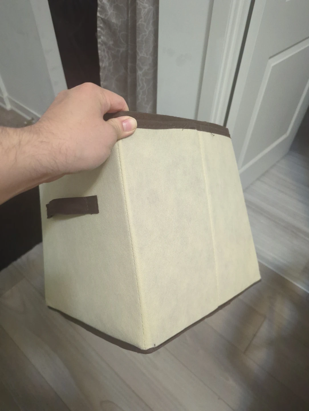 This is a collapsible storage bin, perfect for organizing your home. It's made of fabric with brown trim and features two side handles. When not in use, it folds flat for easy storage. Great for closets, shelves, or under the bed!