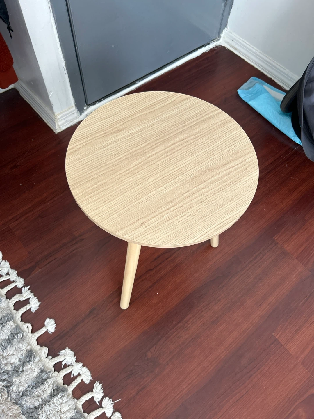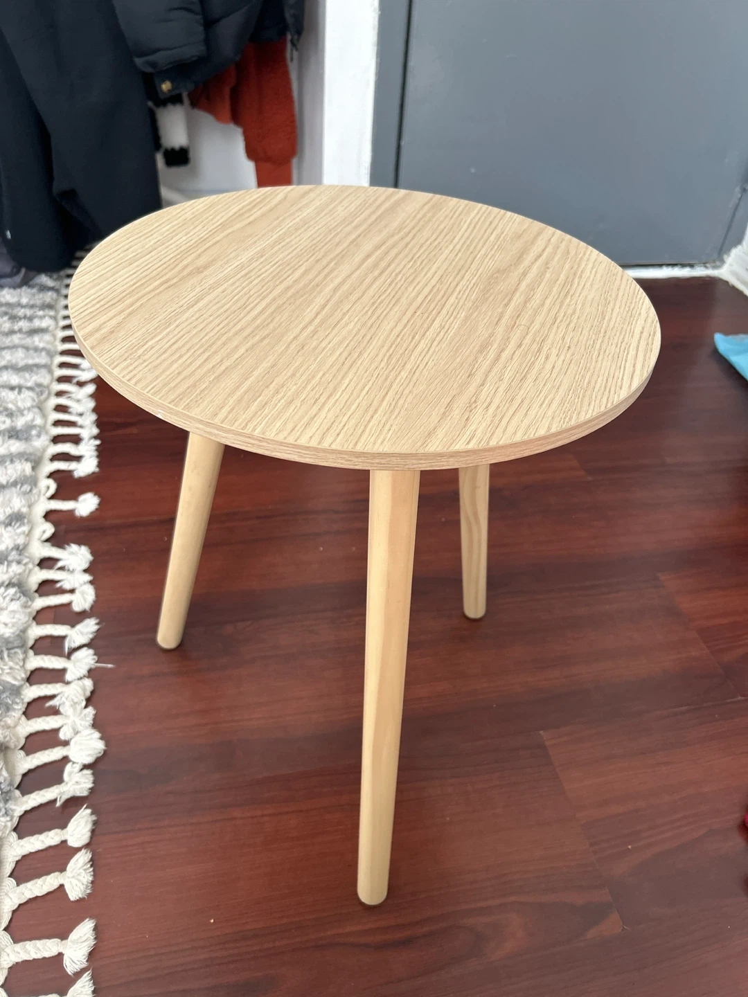 This round accent table features a light wood finish and three tapered legs. It's a versatile piece for any room. Compact size works well for small spaces.
