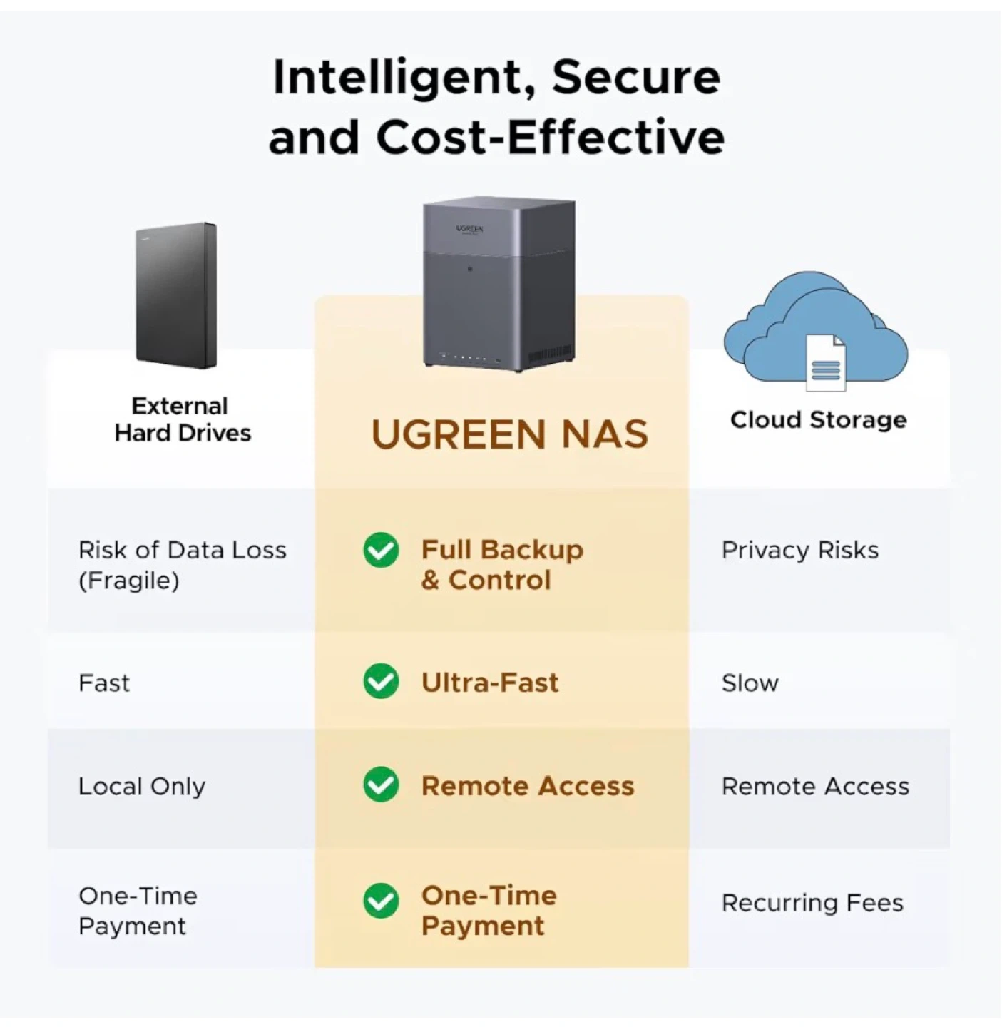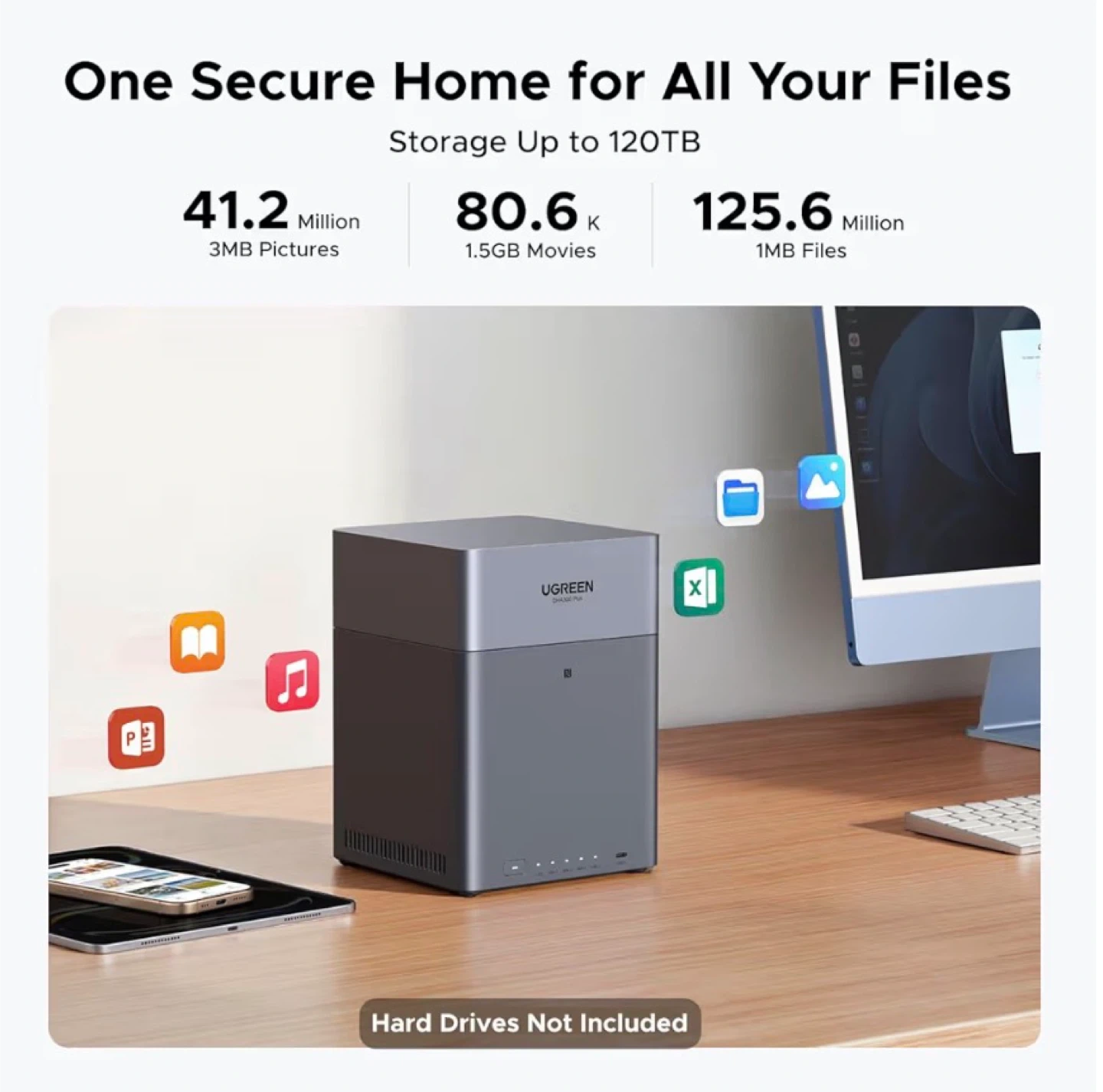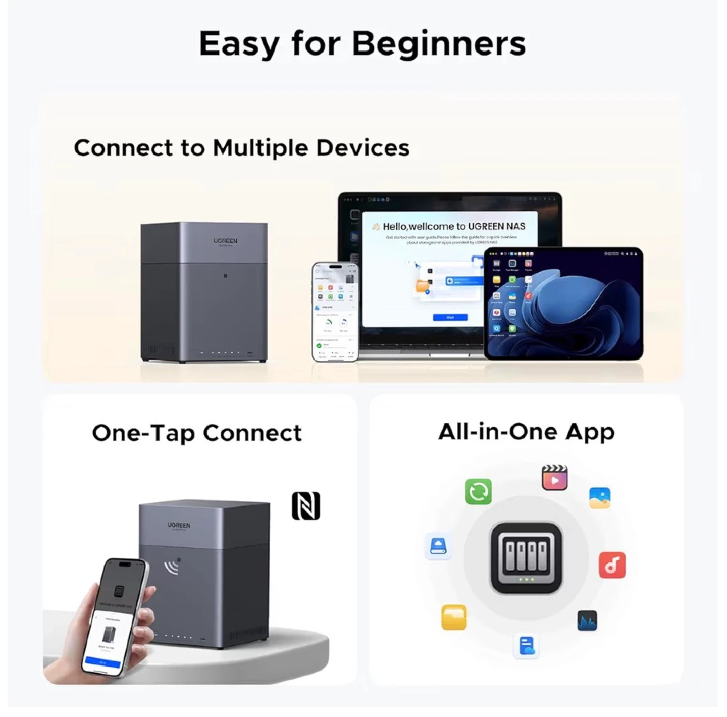 This UGREEN NAS offers easy setup and connects to multiple devices. It features one-tap connect and an all-in-one app for managing your files. It's great for smart search, file sync, and online editing.