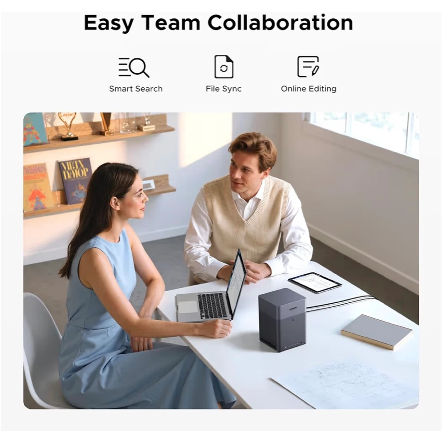 This UGREEN NAS offers easy setup and connects to multiple devices. It features one-tap connect and an all-in-one app for managing your files. It's great for smart search, file sync, and online editing.