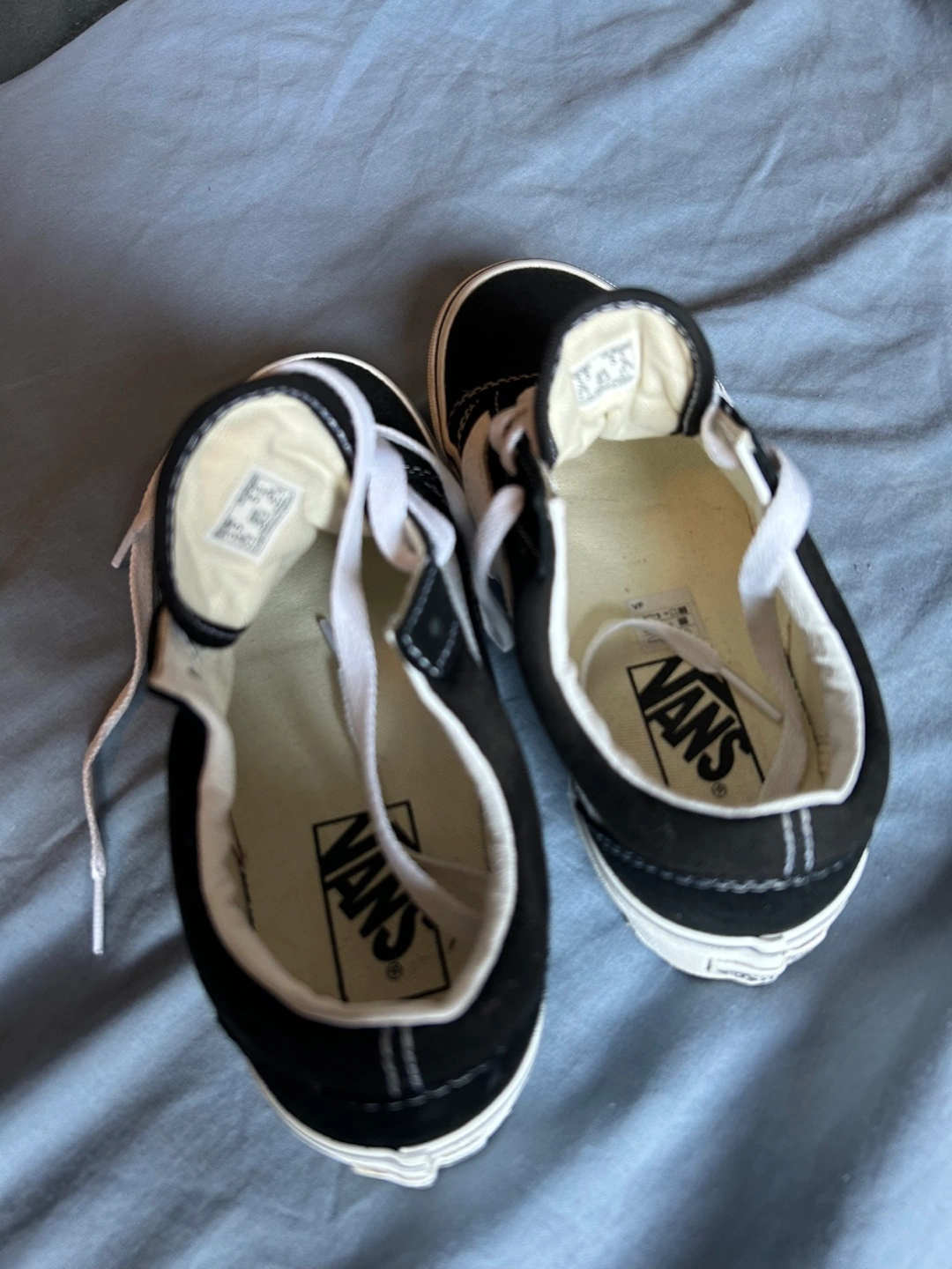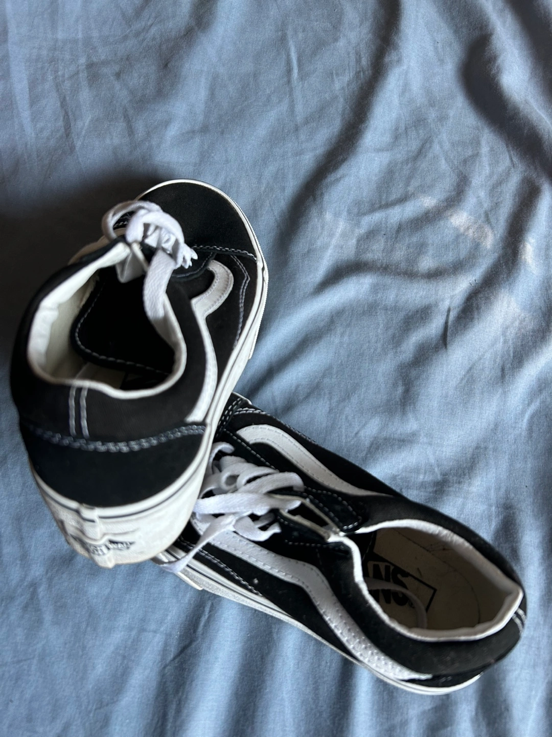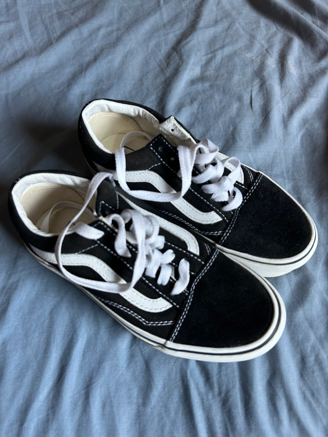 Classic black and white Vans Old Skool sneakers. Low-top design. White laces. Brand new, never worn