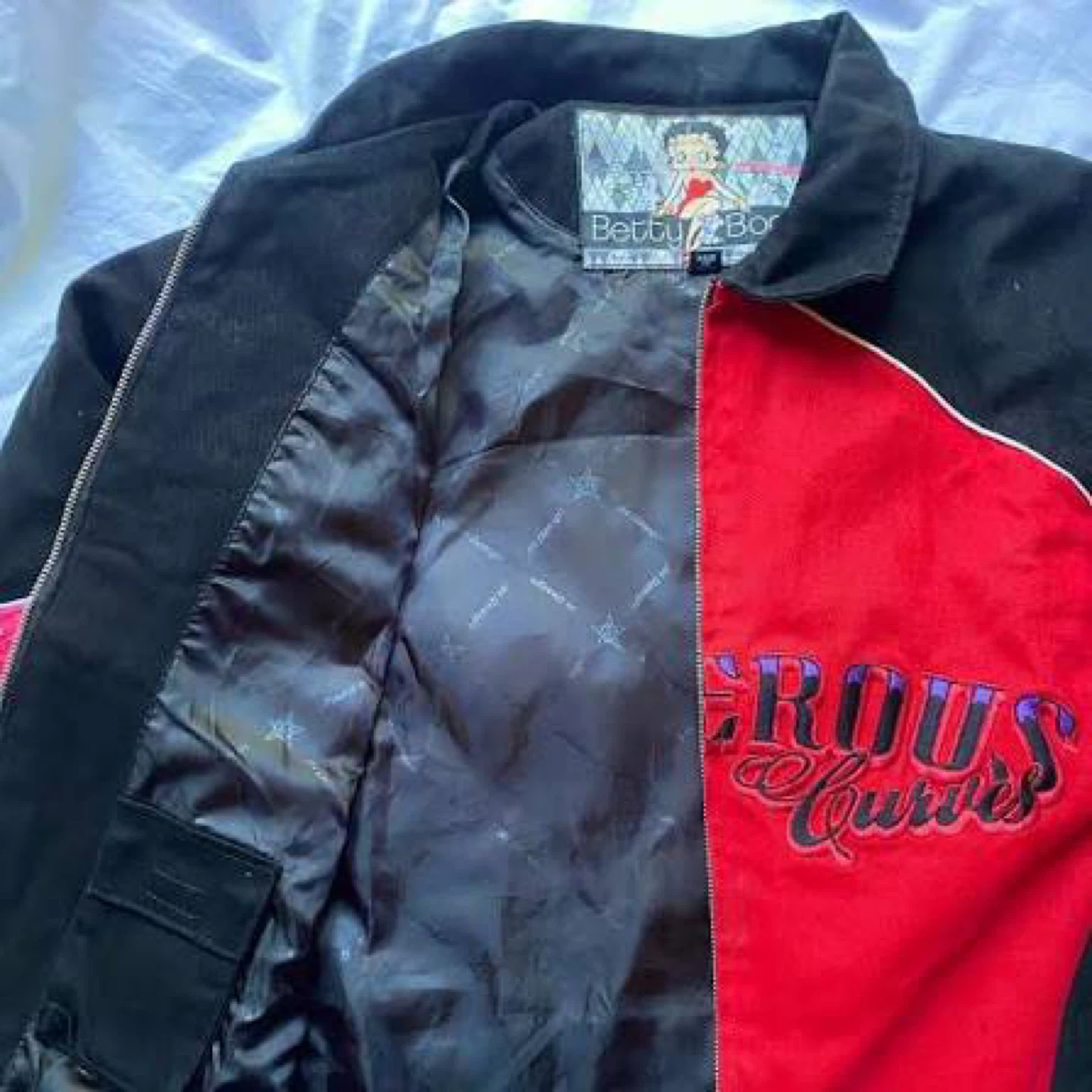 This Betty Boop jacket features "Dangerous Curves Ahead" embroidery and graphic print. It's black and red with bandana print accents on the sleeves. The lining is black satin with a subtle pattern. It's a unique piece for any fan!