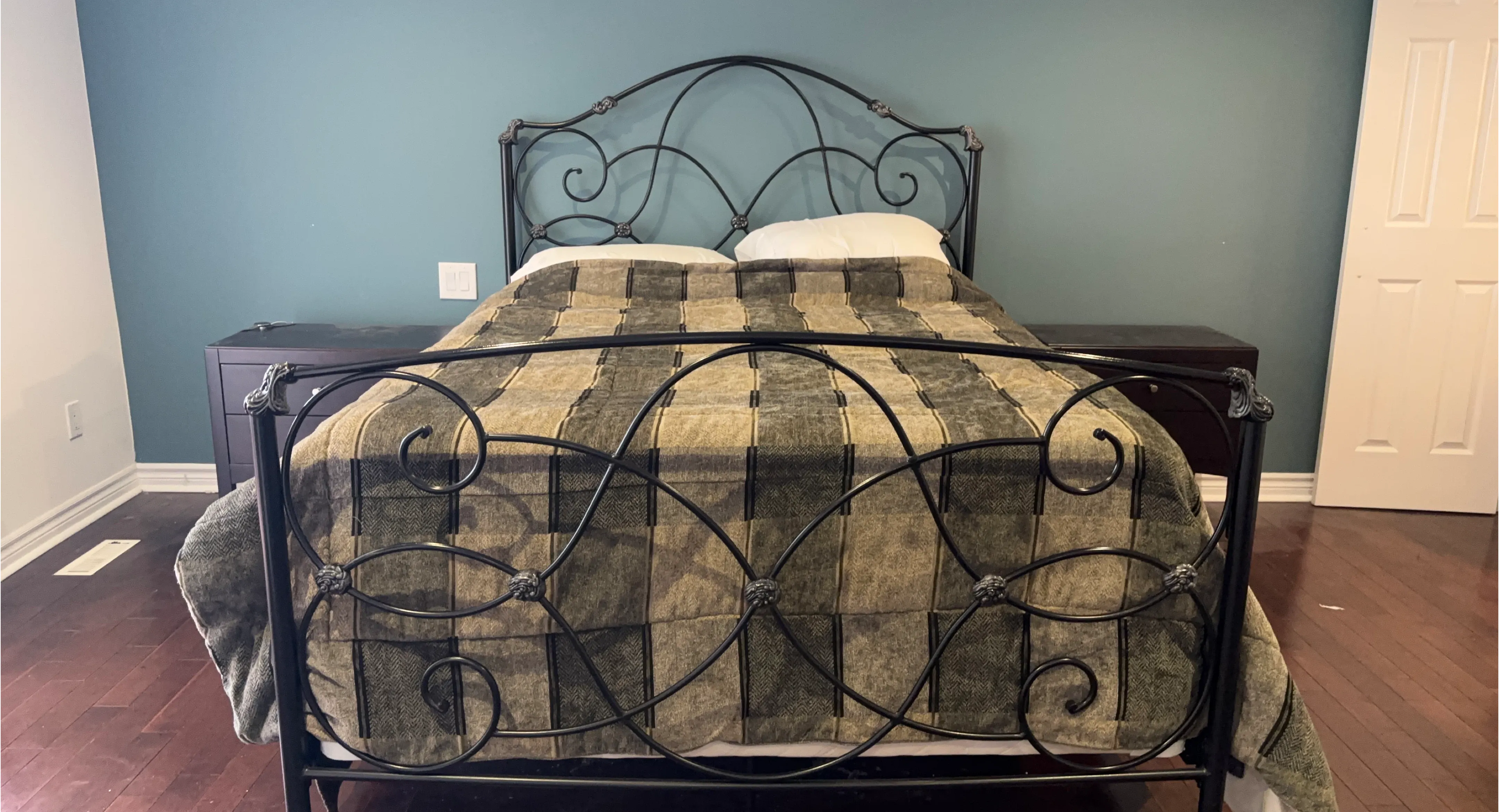 This is a black metal bed frame featuring a decorative scrollwork design on the headboard and footboard. It includes a coordinating duvet cover with a plaid and herringbone pattern. The frame is sturdy and adds a stylish touch to any bedroom. It's a queen size bed. Mattress included.