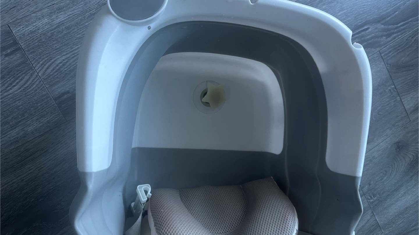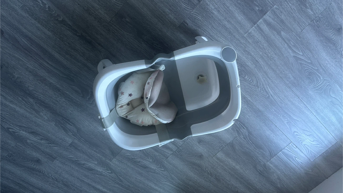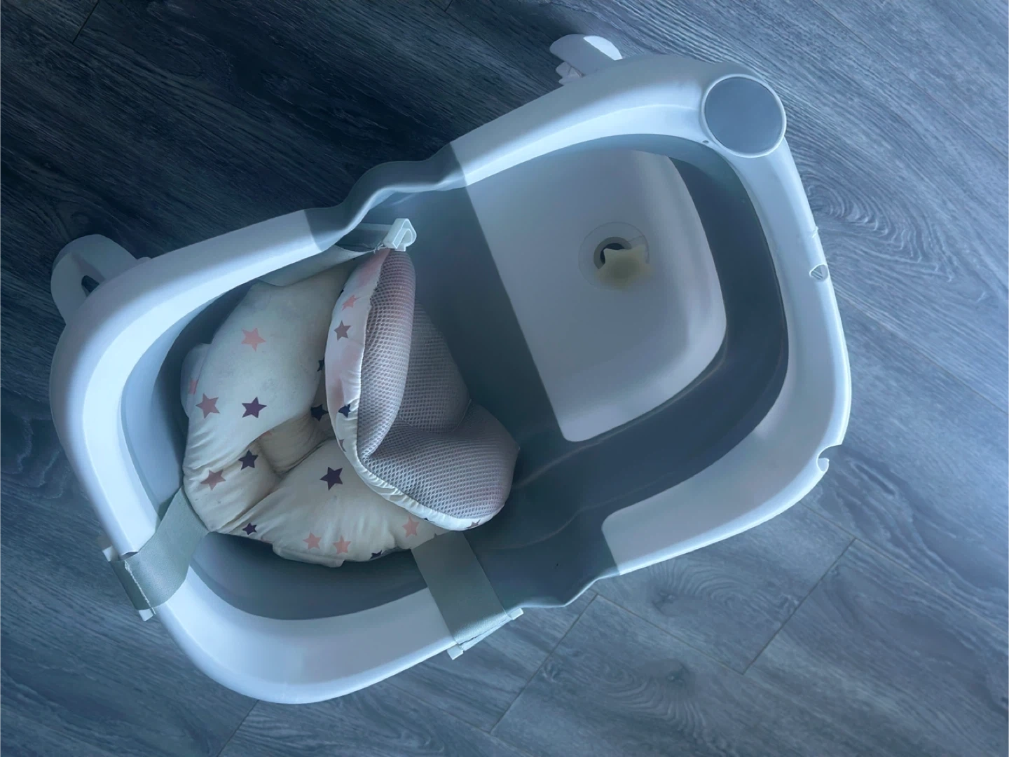 This handy collapsible baby bathtub is perfect for bathing little ones. It comes with a soft, star-patterned cushion for comfort. The tub is made of durable plastic and features a convenient drain plug.