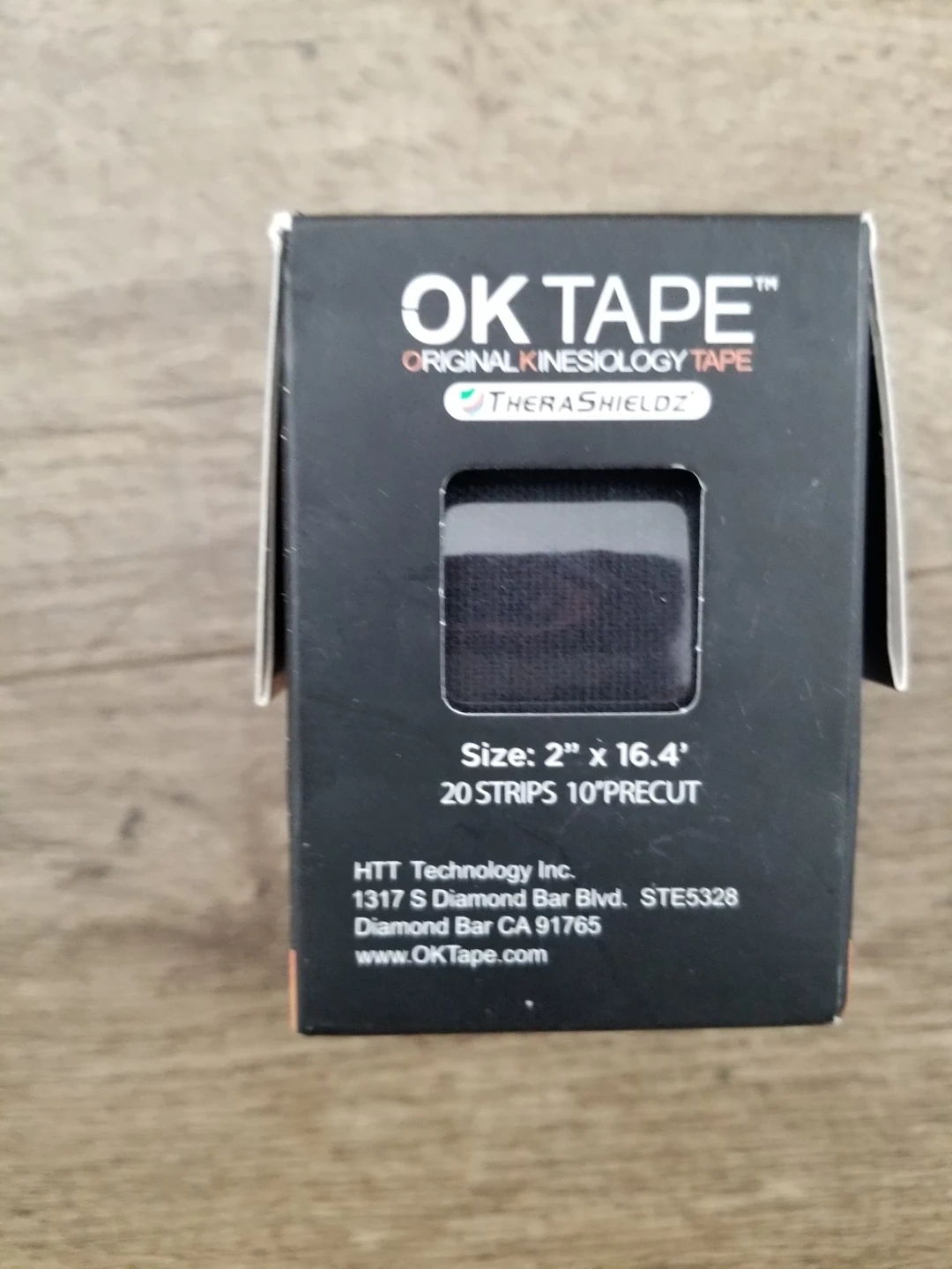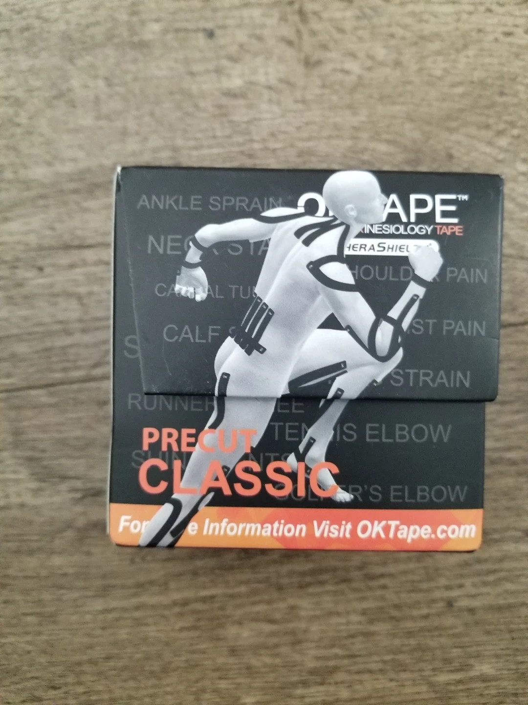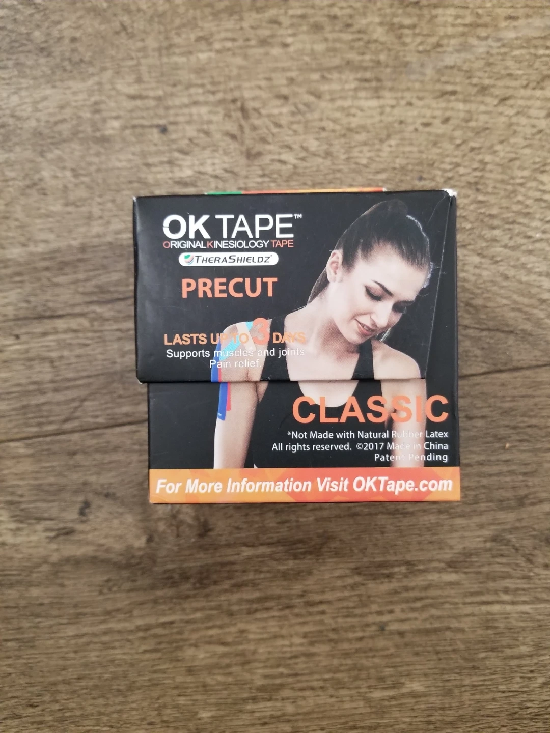 This is OK Tape Original Kinesiology Tape in the Classic precut style. It's made with THERA-SHIELDZ and supports muscles and joints. The tape comes in strips measuring 2" x 16.4', with 20 precut strips.