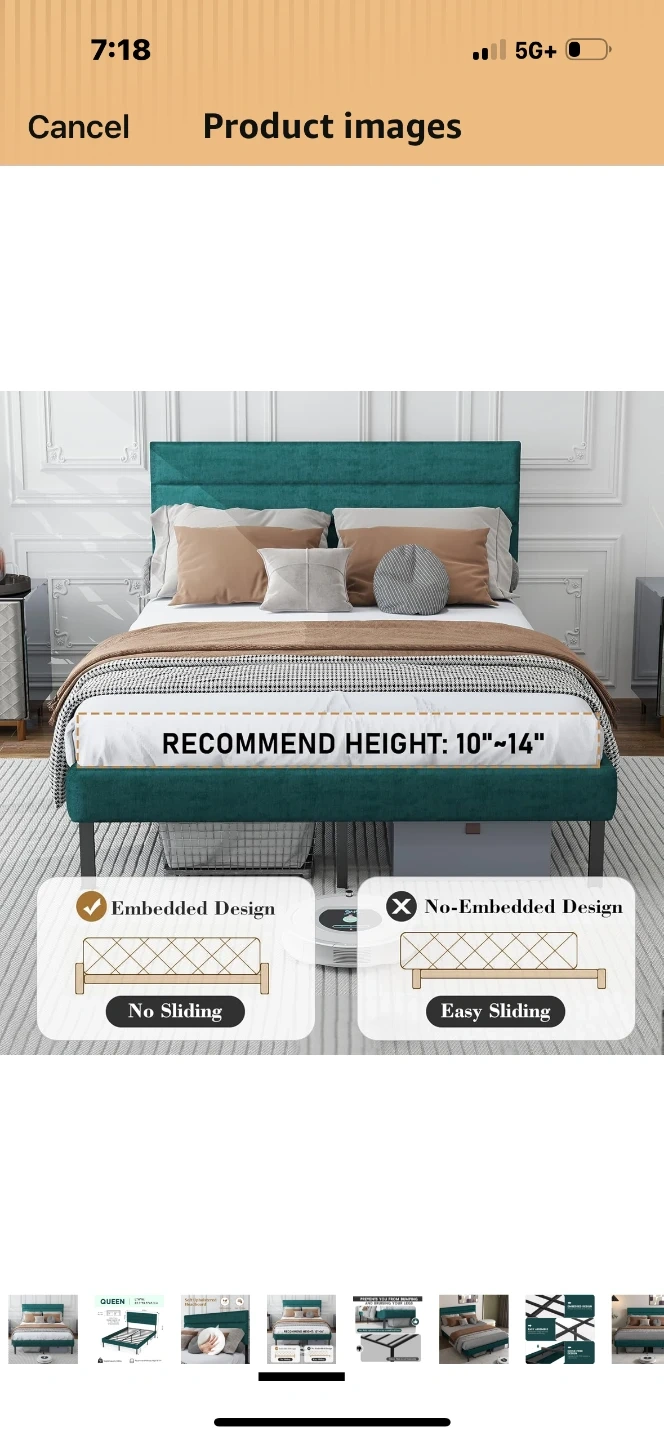 This is a queen-sized bed frame with a teal upholstered headboard and frame. It features a noise-free design with EVA sponge to reduce squeaks. Easy assembly required. Recommended mattress height is 10"-14".