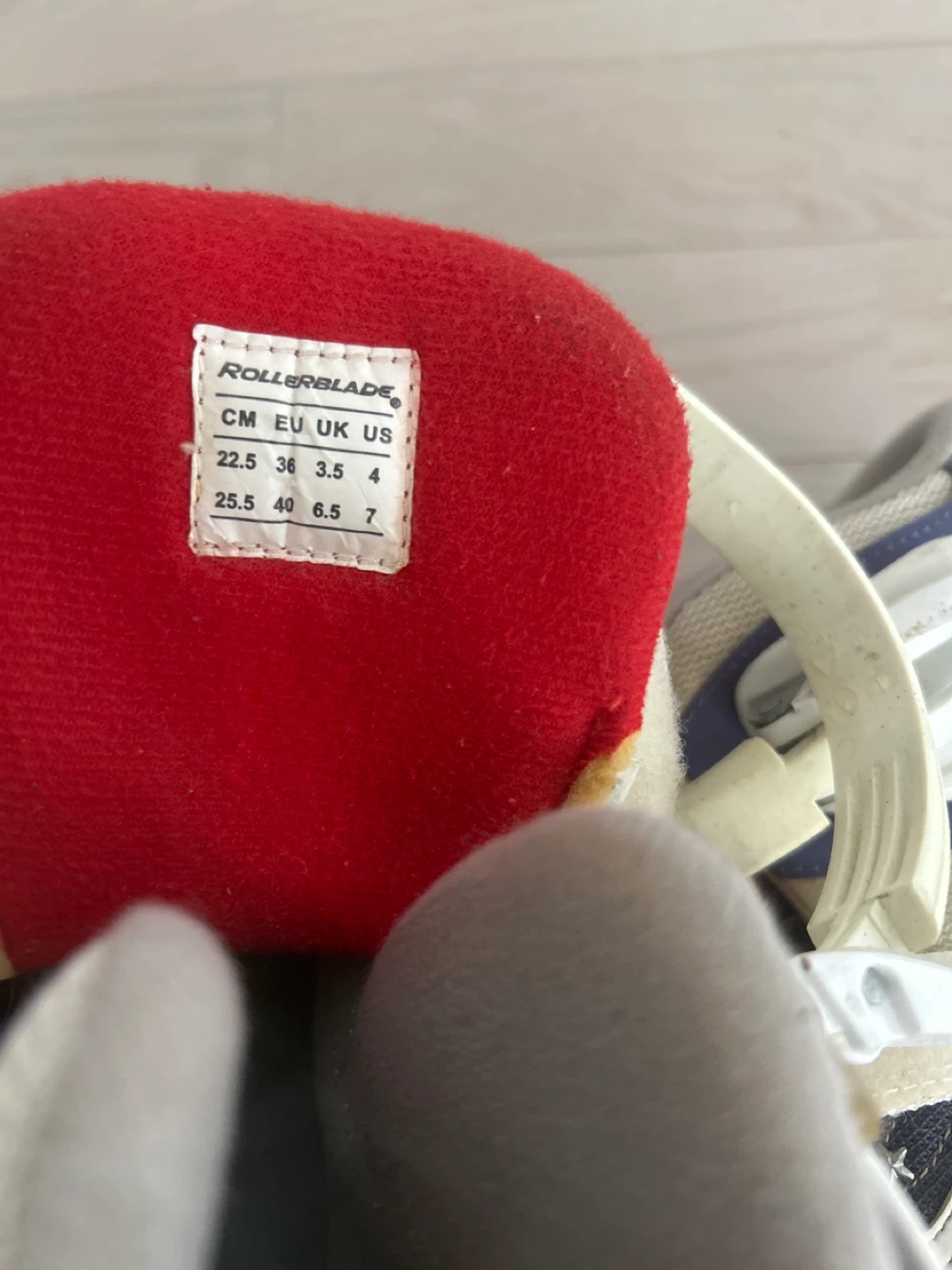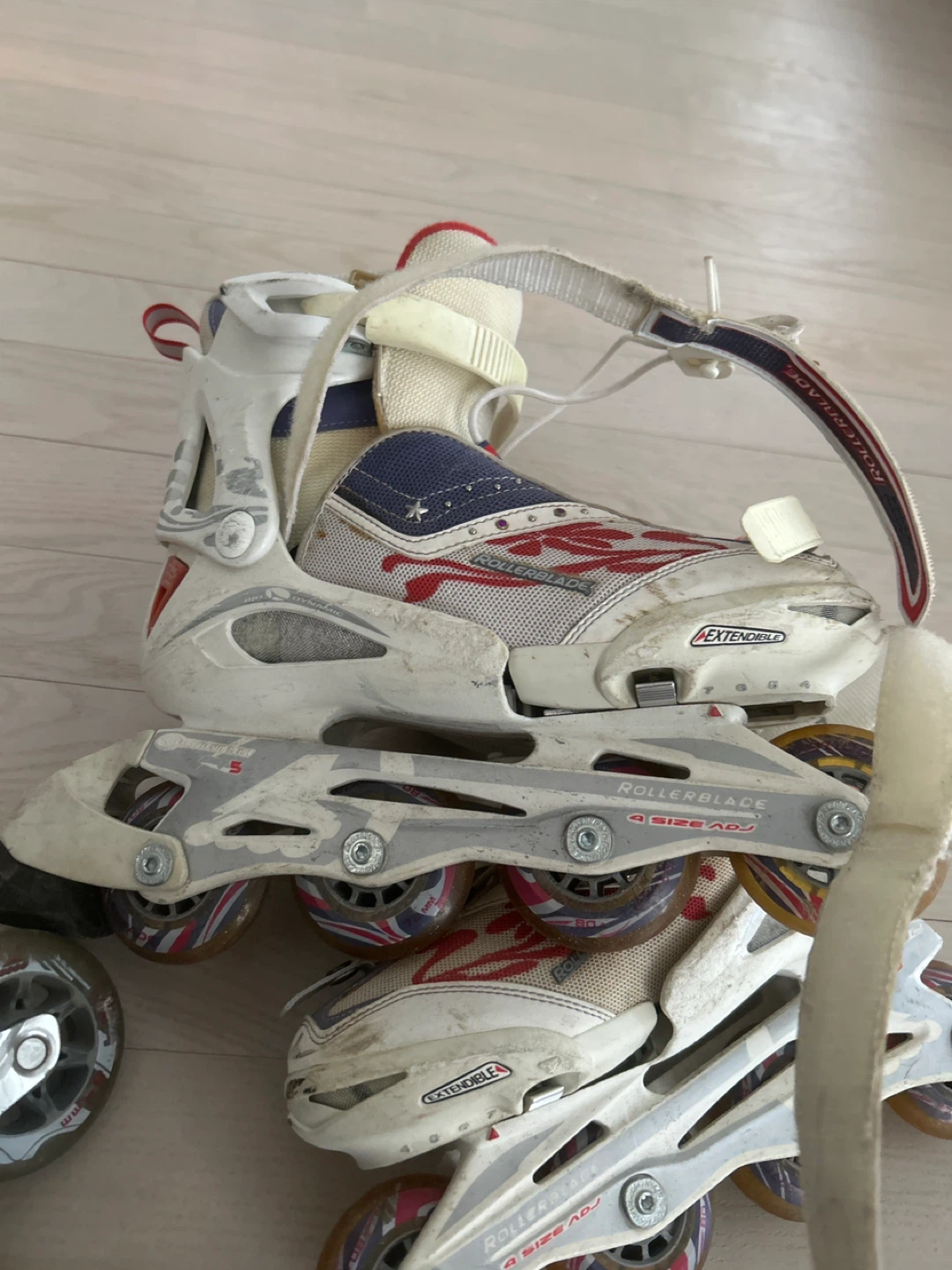 These Rollerblade inline skates are a youth size 4. They feature a white and red design with adjustable sizing. The skates are designed for recreational use.