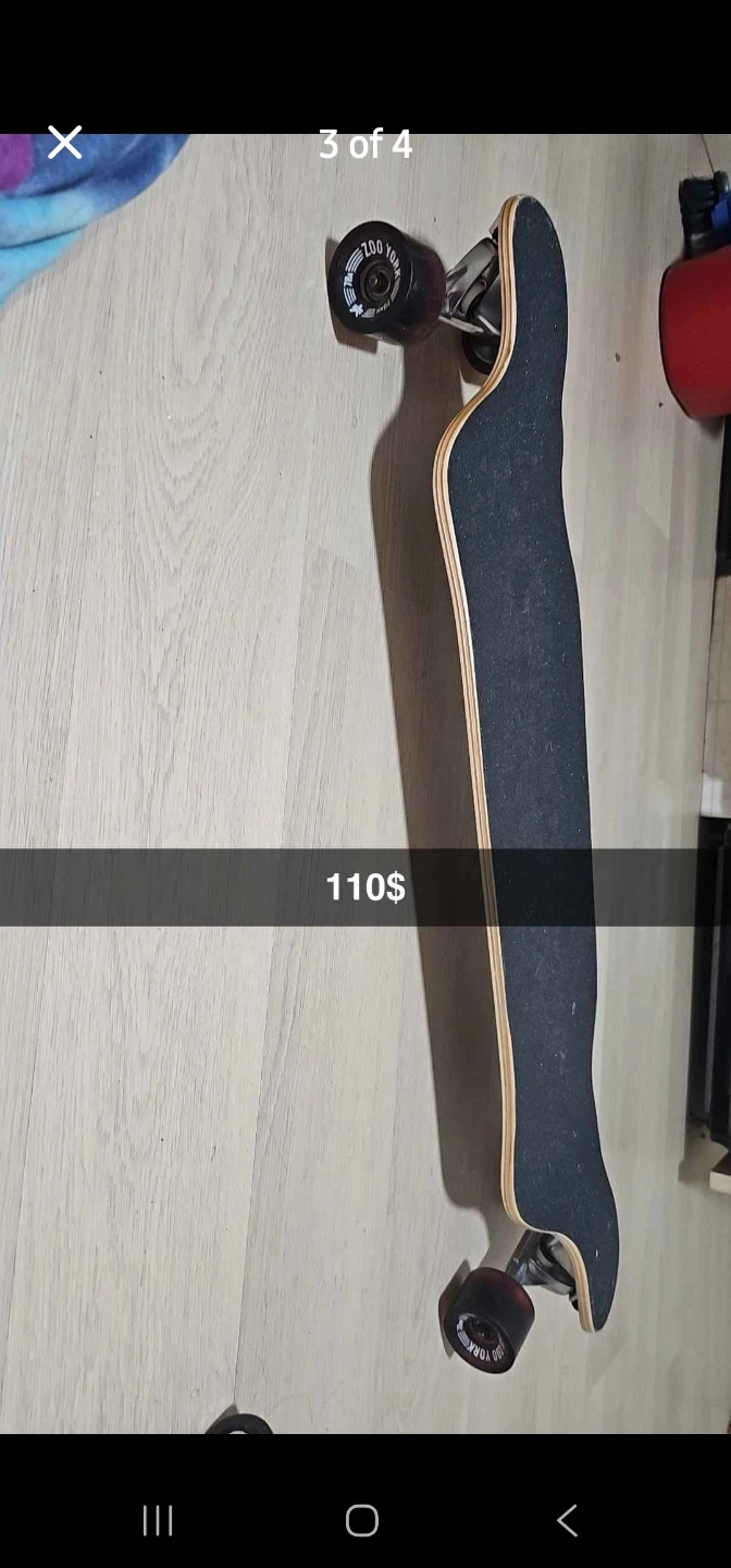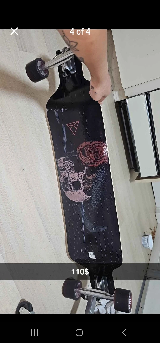 This longboard features a cool skull and rose graphic. It's built for cruising with smooth-rolling wheels. Deck is wood with grip tape.