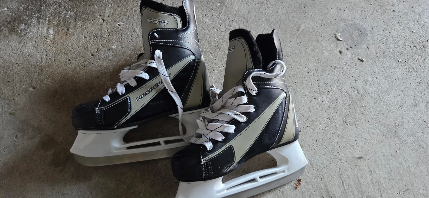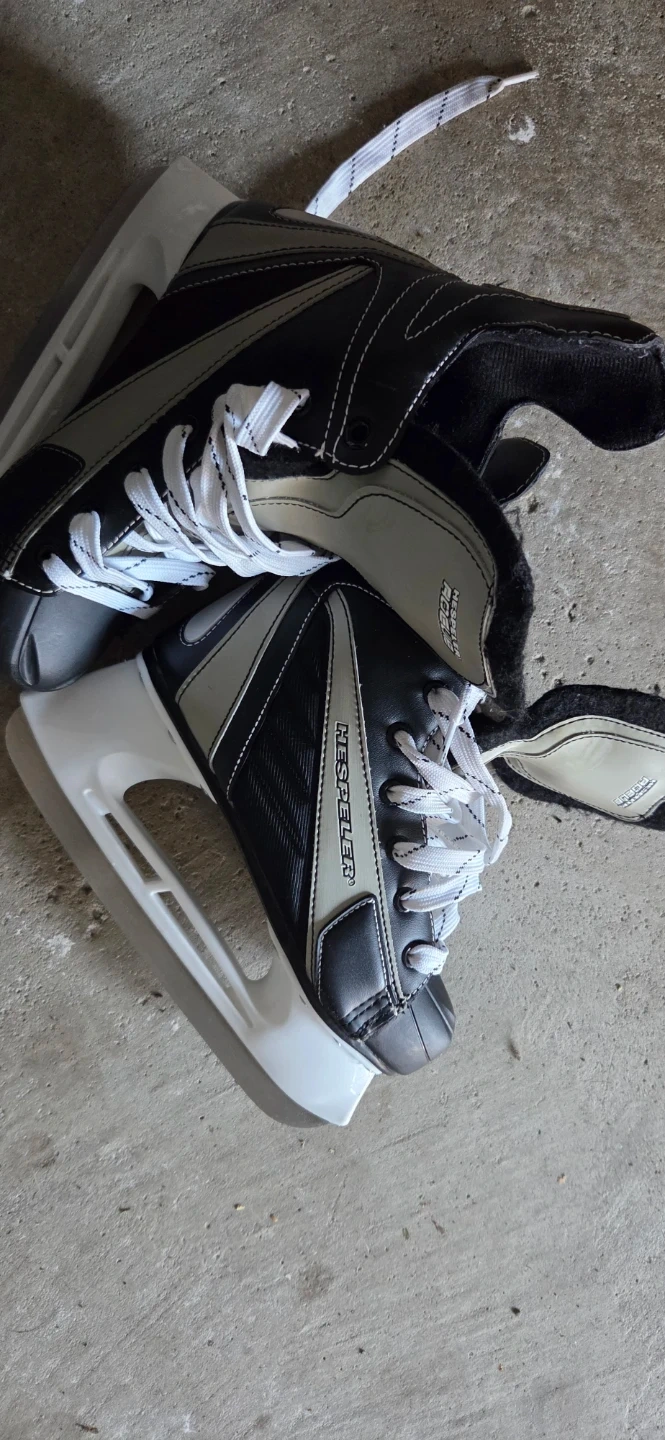 These are Graf hockey skates, size US 5. They are black and grey with white laces. The inside collar is black and fuzzy for comfort.