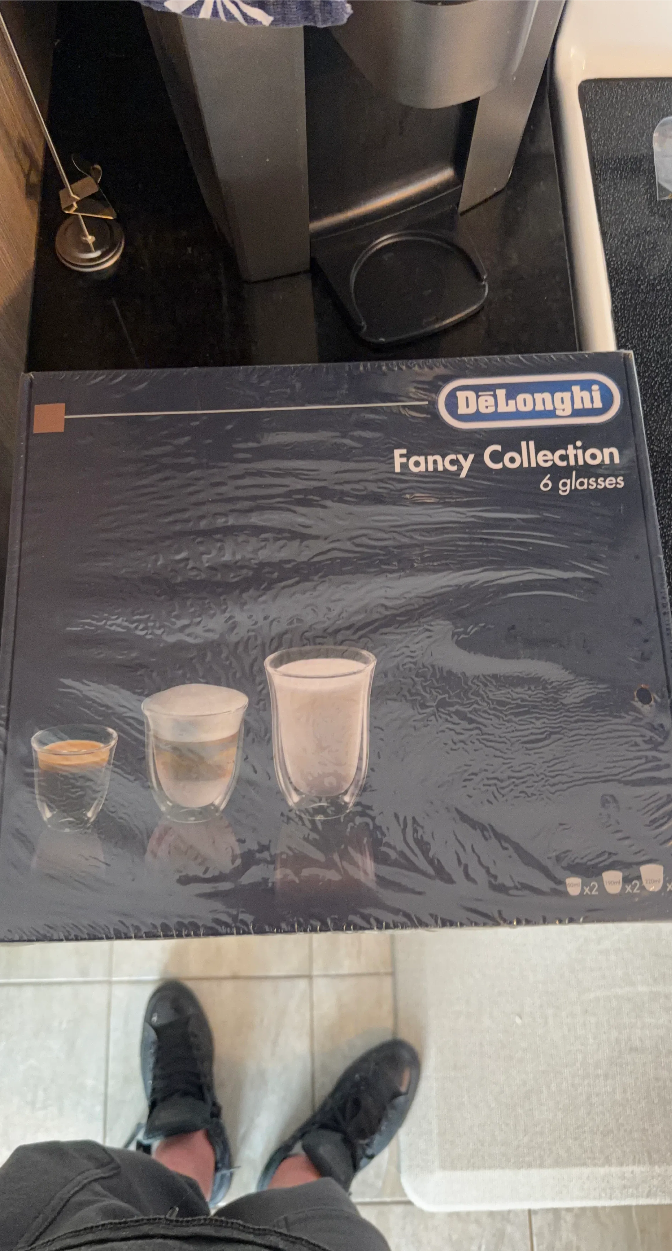 This is a set of 6 DeLonghi double-walled glasses from the Fancy Collection. It includes 2 glasses of 60ml, 2 glasses of 100ml, and 2 glasses of 220ml. These glasses are great for keeping beverages at the right temperature!