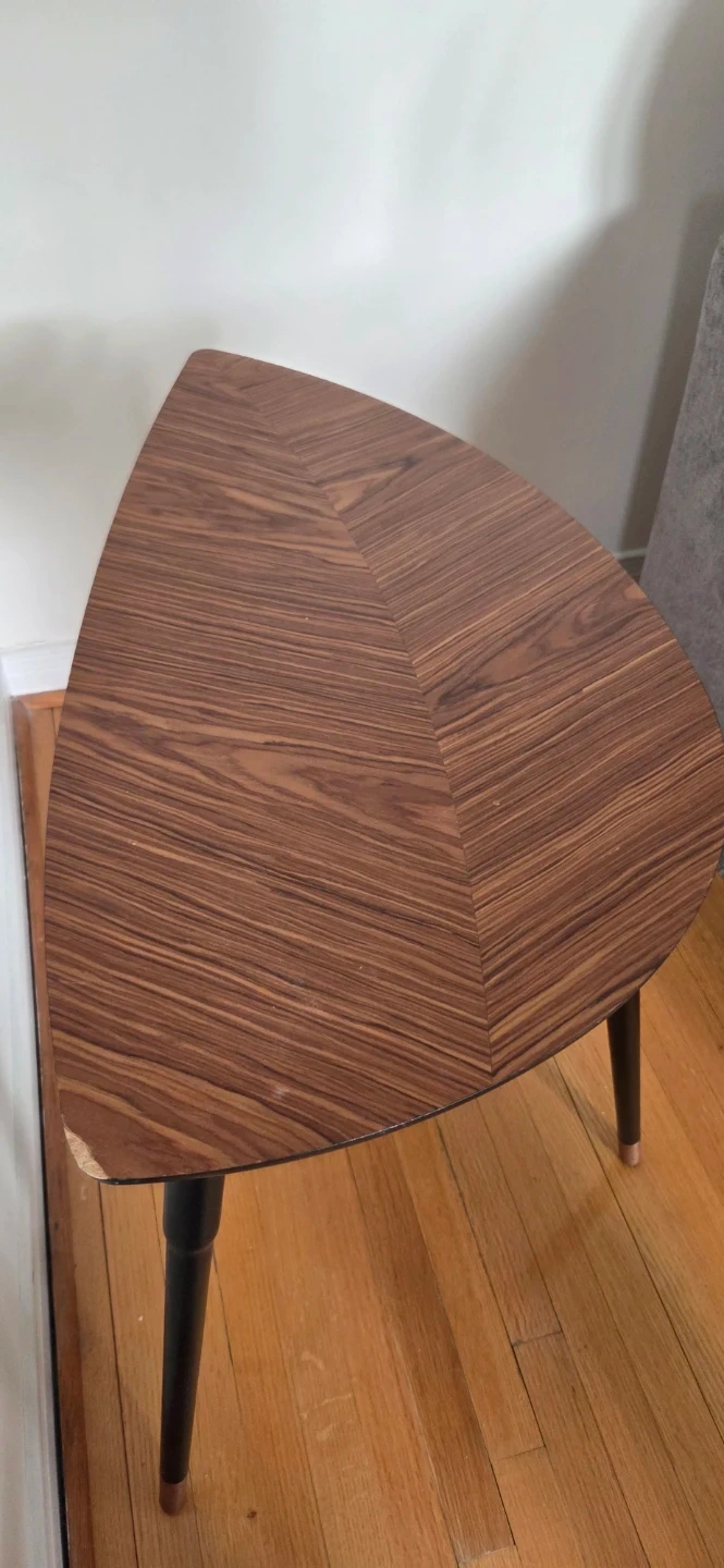 This half-moon shaped accent table features a dark wood-grain top with a unique pattern. It has three black tapered legs with copper-coloured feet.