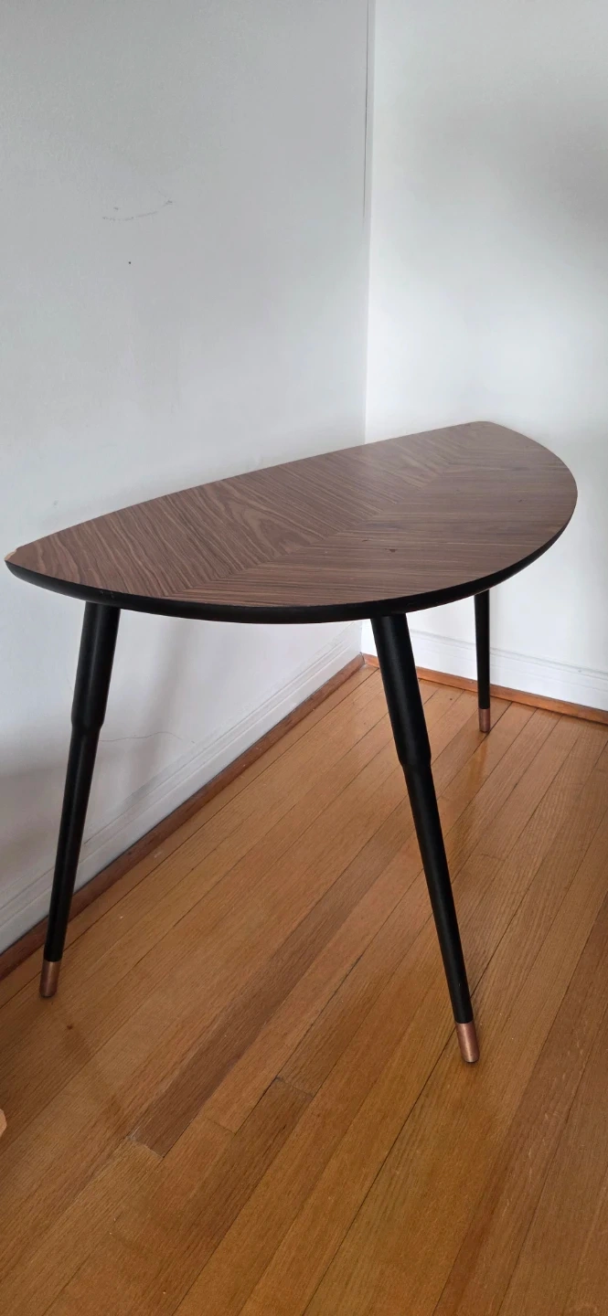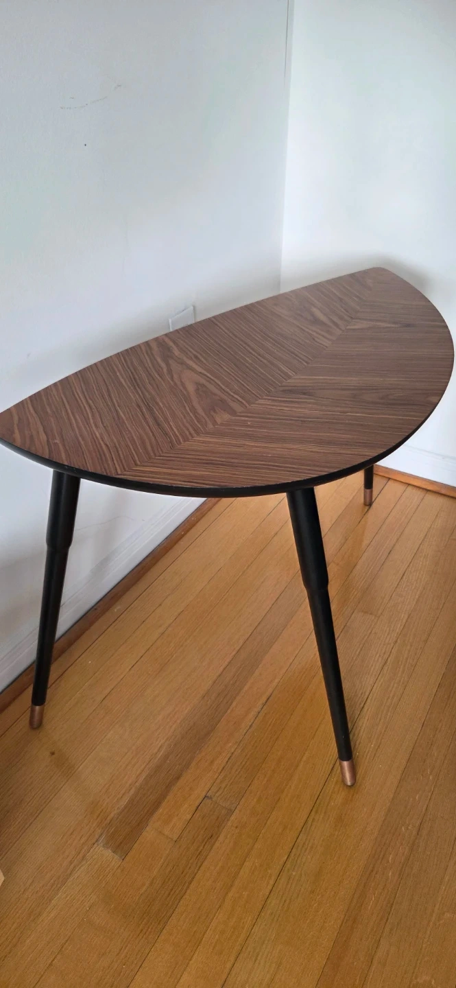 This half-moon shaped accent table features a dark wood-grain top with a unique pattern. It has three black tapered legs with copper-coloured feet.