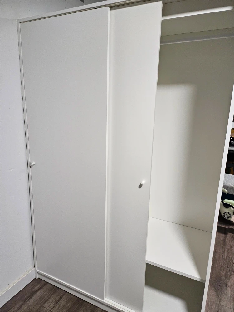 It has 2 sliding doors and comes with shelves and a clothes rail.