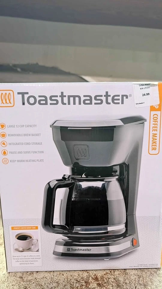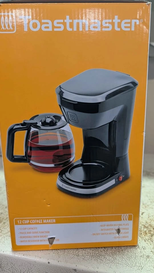 New black Toastmaster coffee maker with 12 cup capacity. Features pause and serve function with a removable brew basket and glass carafe. Unit has integrated cord storage and a keep-warm heating plate. On/off switch with power light is on the base.