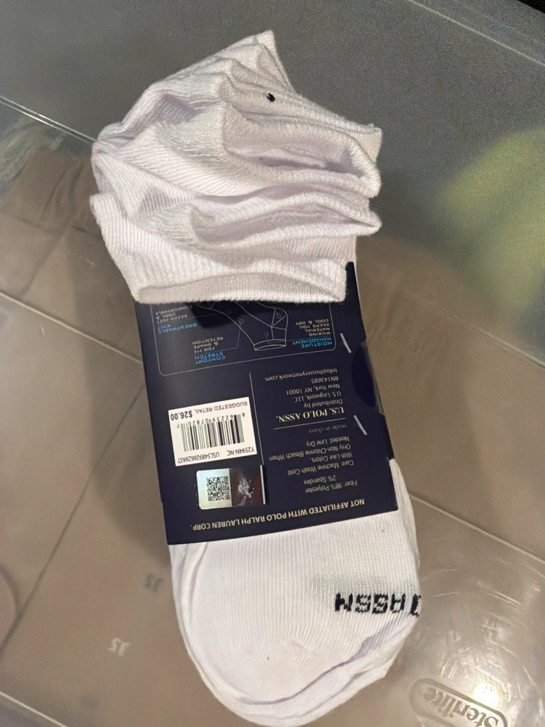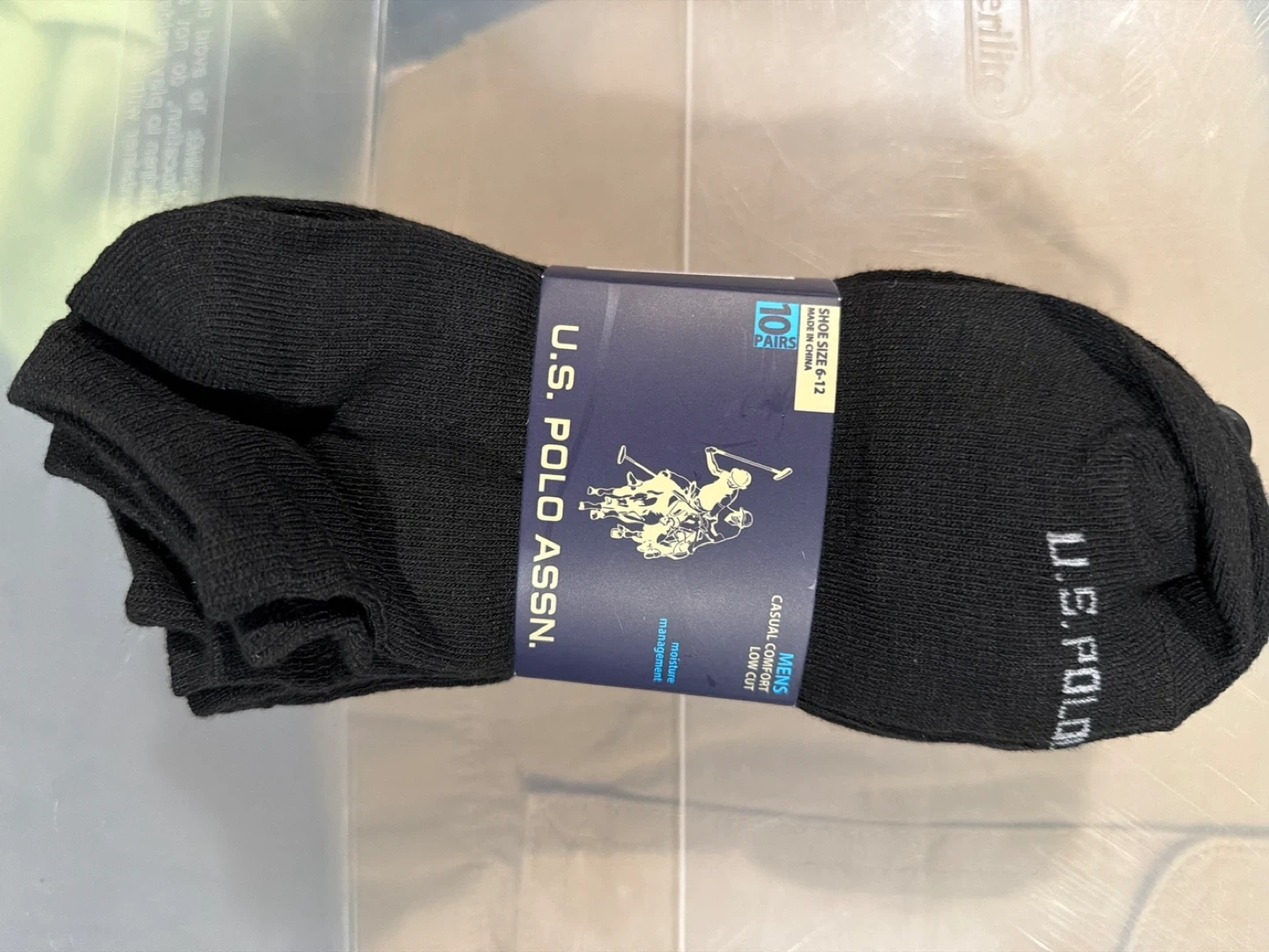 This is a 10-pair pack of U.S. Polo Assn. men's low cut casual socks in black. They're made with 95% polyester and 5% spandex for comfort. Shoe size 6-12. Moisture management and breathable fabric. They're designed for everyday wear.