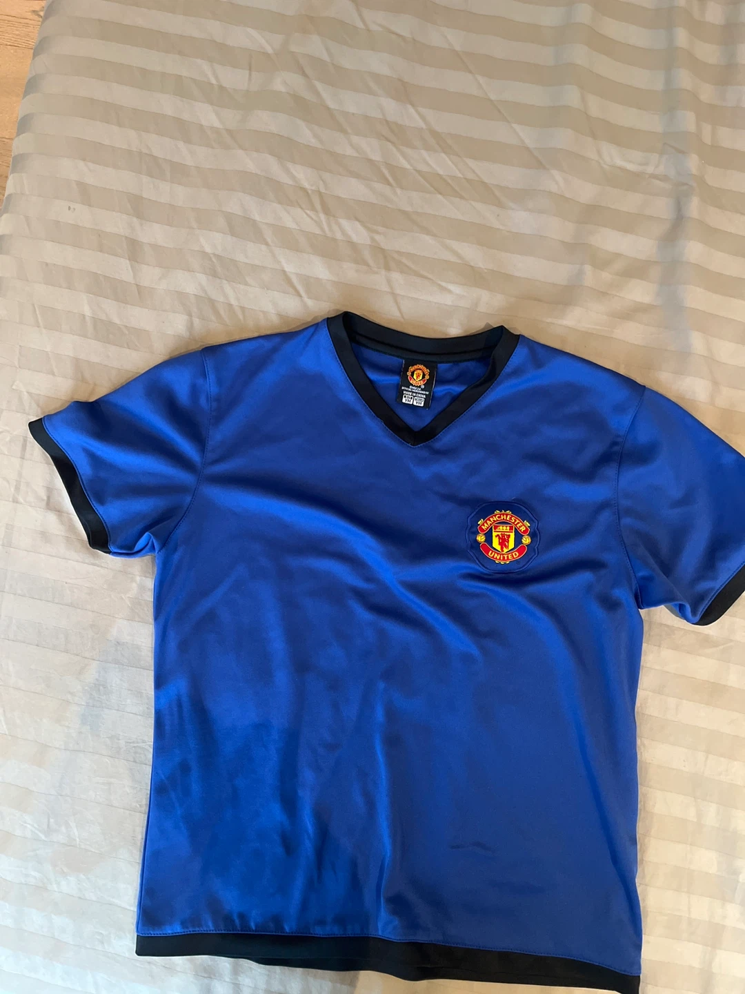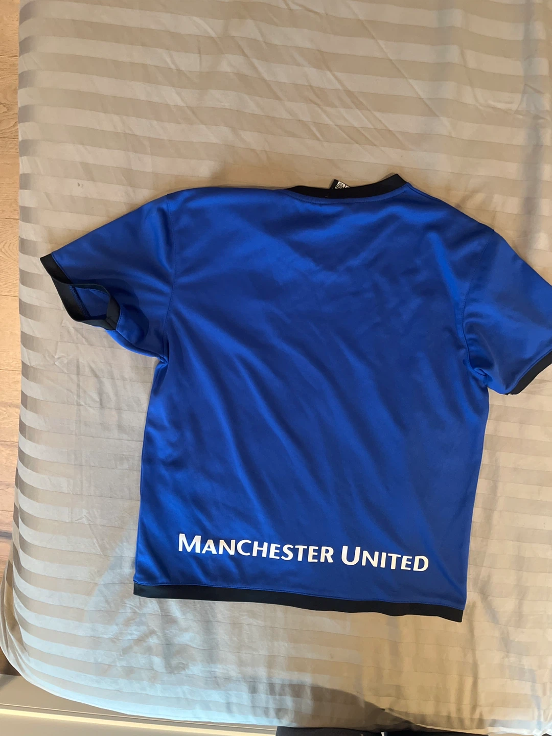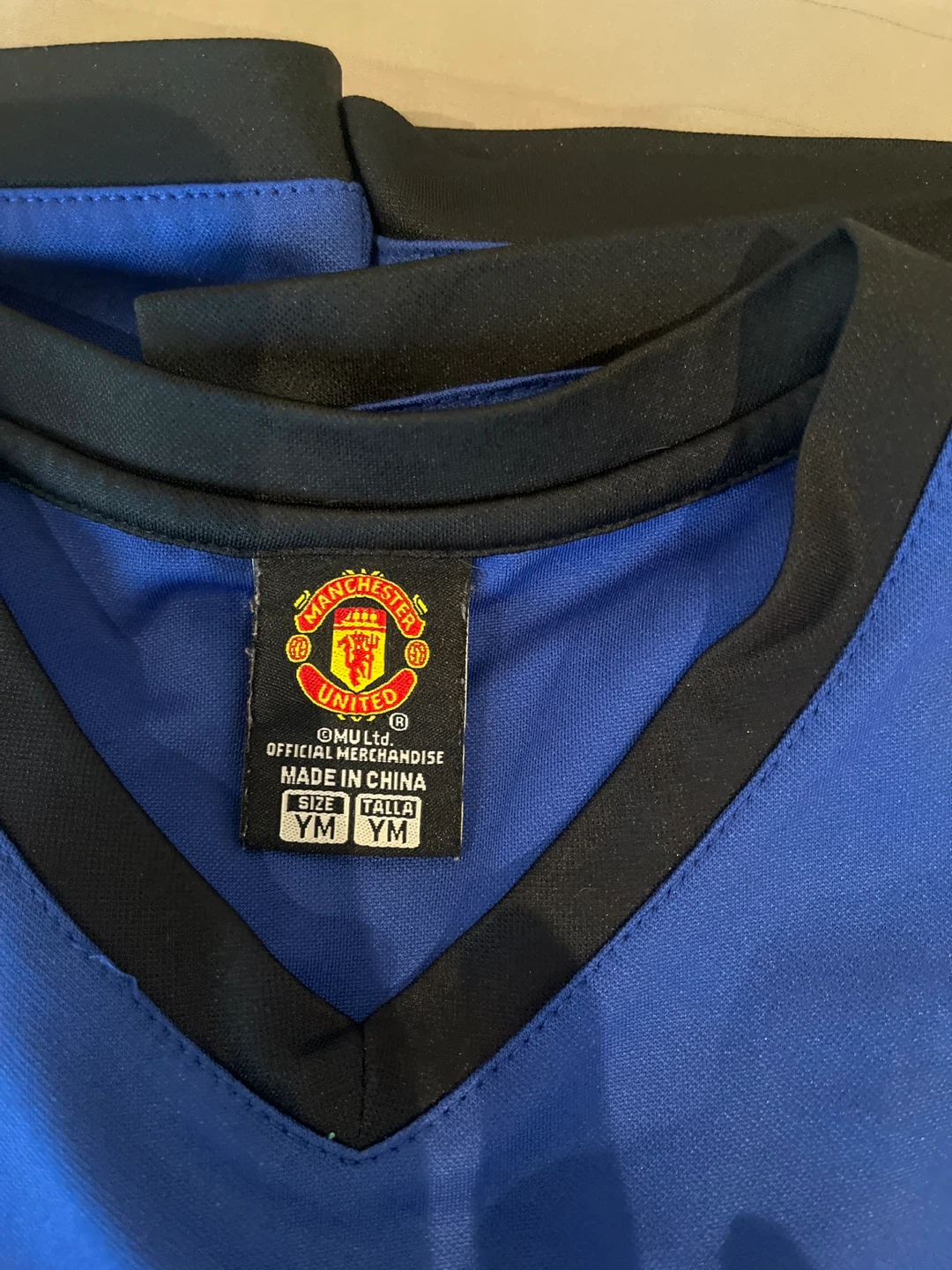 Selling a Manchester United jersey in size YM (Youth Medium). The jersey is blue with black trim and features the Manchester United logo. Great for any young fan! Purchased in the UK.