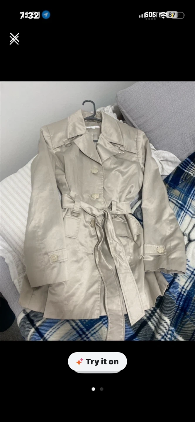 A shiny beige trench coat with a belt. It features button closures and decorative buttons on the cuffs. Material is likely a polyester blend. Pick up cash only