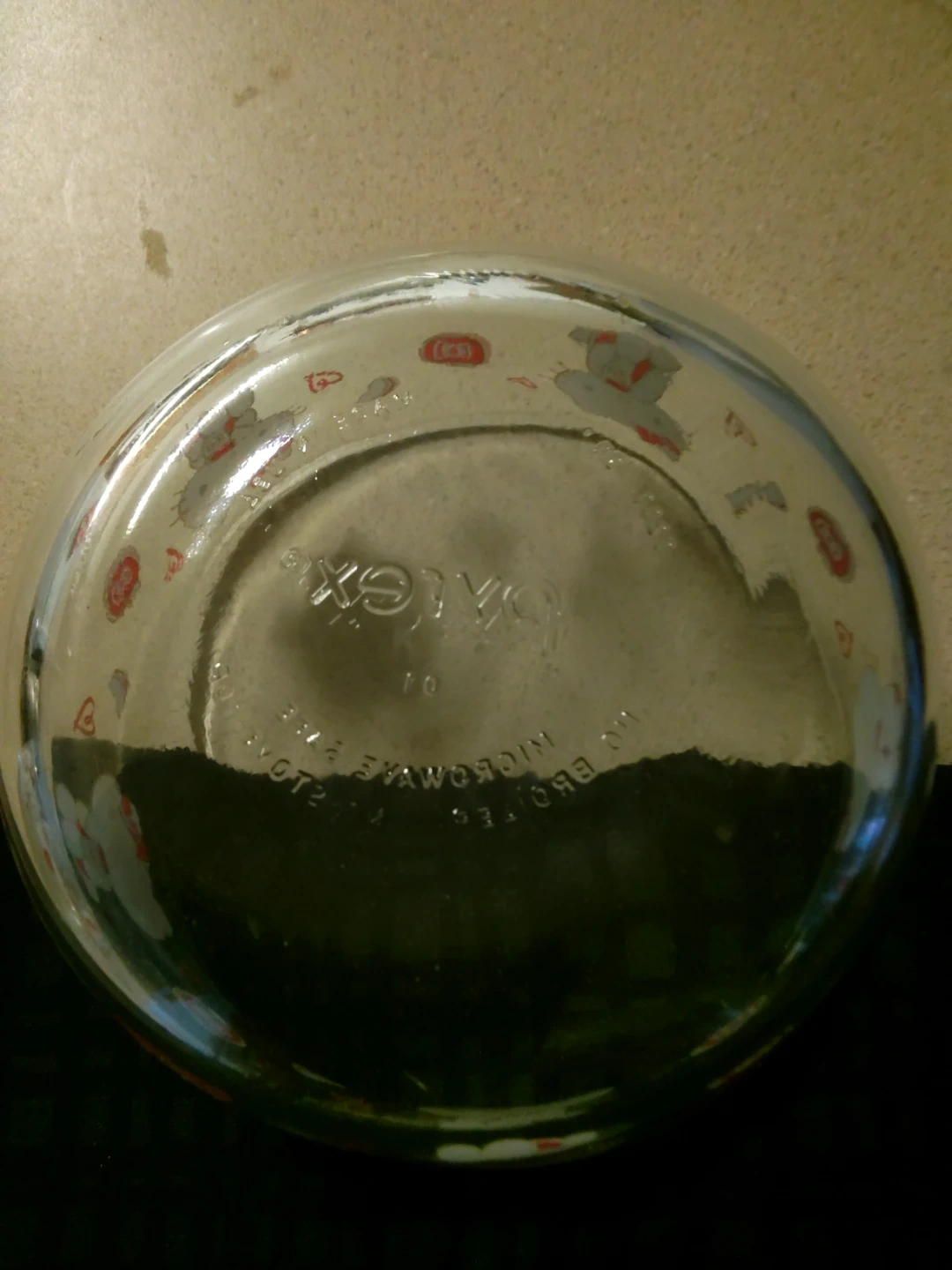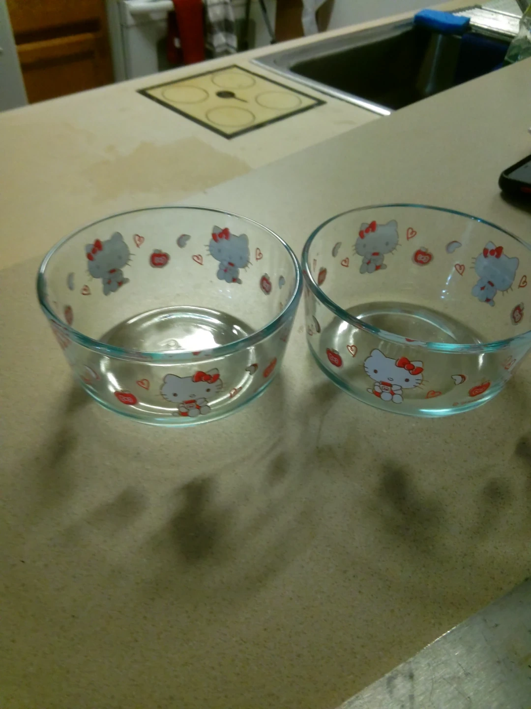 This set includes two clear glass mixing bowls with a cute Hello Kitty design. They're microwave and dishwasher safe. Made in USA.