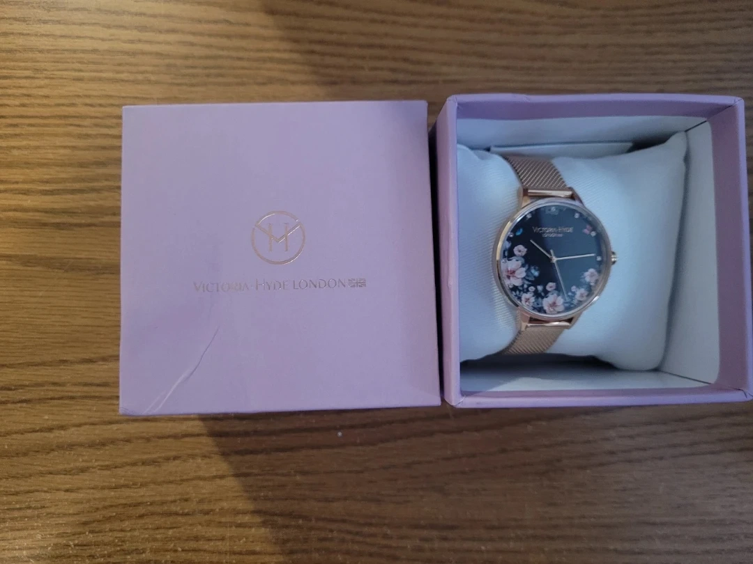 I'm selling a Victoria Hyde London watch with a floral design on the face. It's rose gold coloured with a mesh strap. Comes in its original box. The box is kinda damaged.