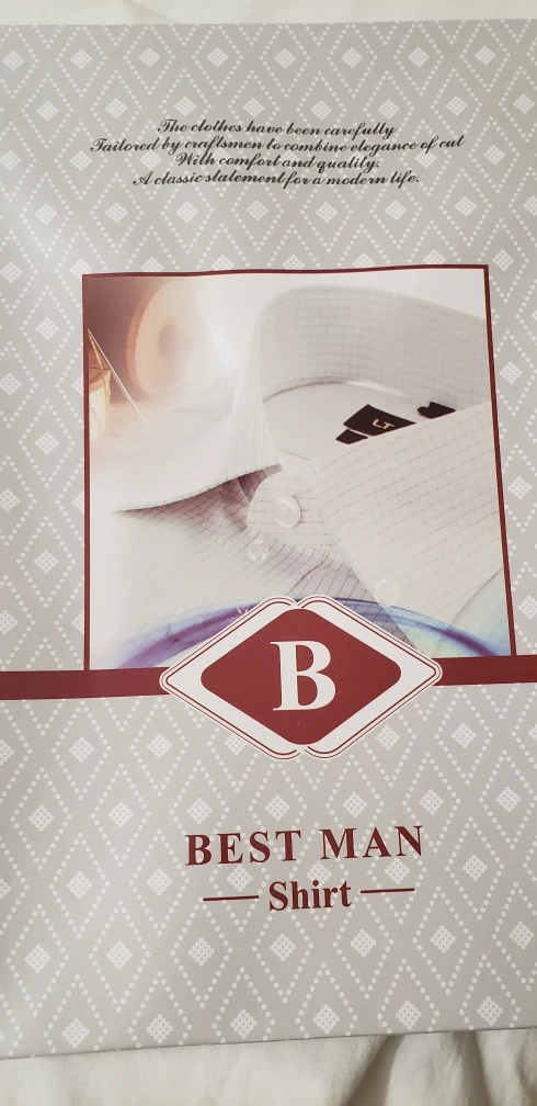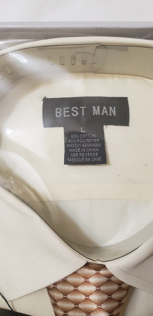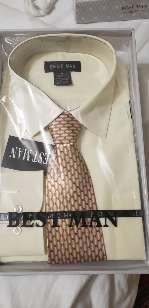 Selling a Best Man shirt and tie set, size large! The shirt is 60% cotton and 40% polyester. It's still in its original packaging, so it's in new condition