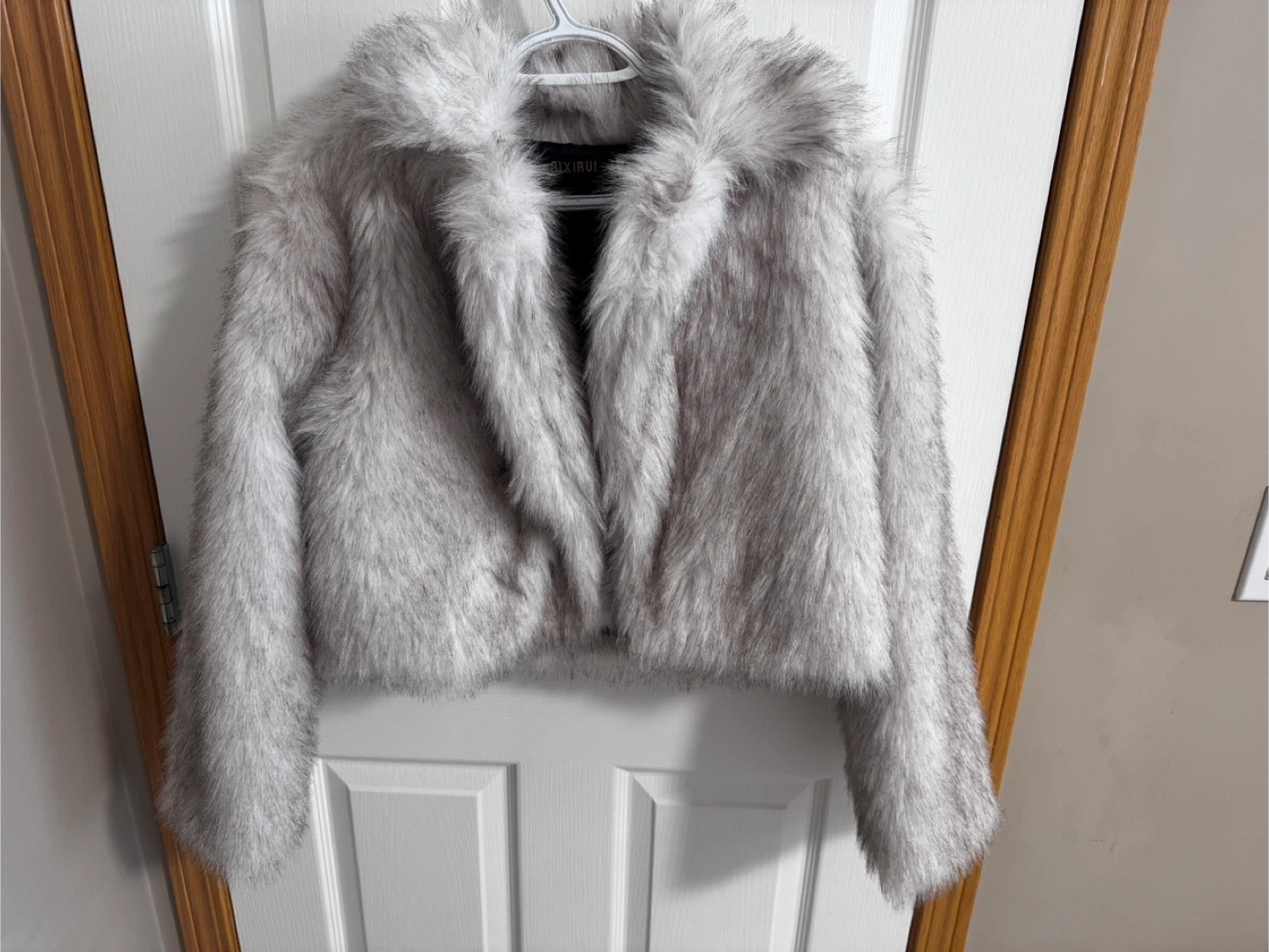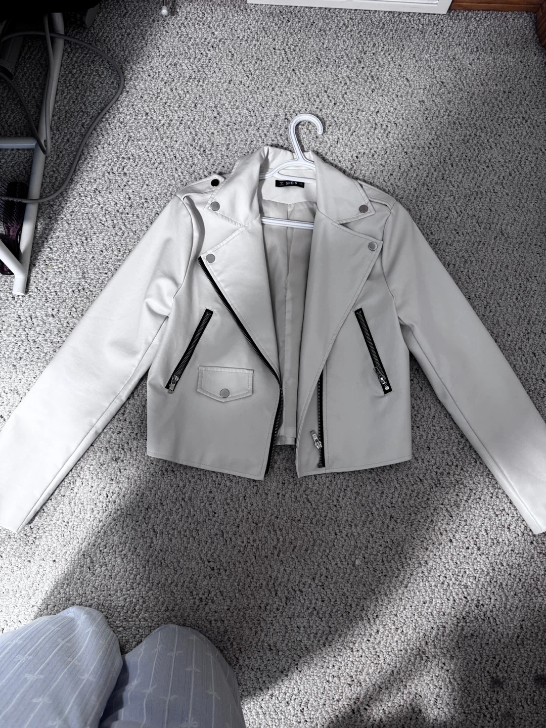 Faux leather moto jacket in white. It has a classic biker style with zip and snap closures. It's a cropped fit with an asymmetrical zipper. This jacket is great for layering over your outfits. Got it and never wear it.