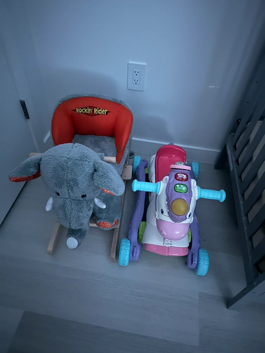 This is a Rockin' Rider plush elephant ride-on toy. It's made with soft plush material and has a sturdy wooden base. Includes a red and grey seat with a "Rockin' Rider" logo.