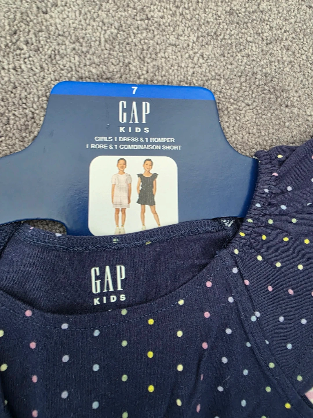 This is a GAP Kids girls' set. It includes one dress and one romper. The dress is navy with colourful polka dots. Size is 7& 4